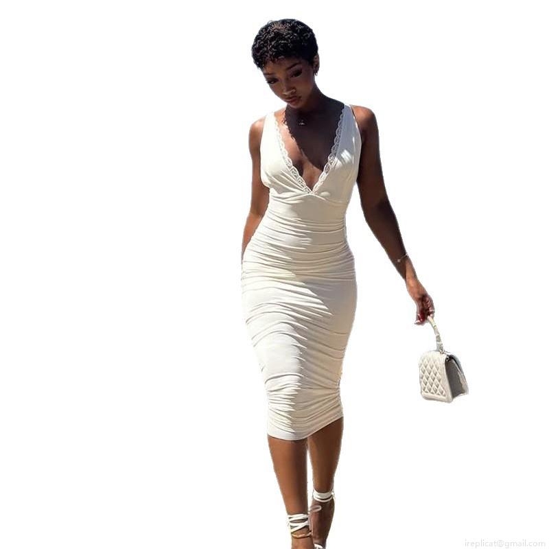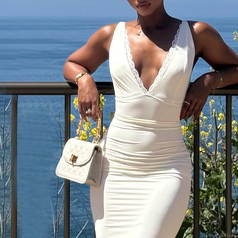 • Women Sexy V Neck Lace Trim Ruched Bodycon Maxi Dress Sleeveless Slim Fit Pleated Backless Long Party Dress For Summer Vacation Date Night Streetwear Women Clothing