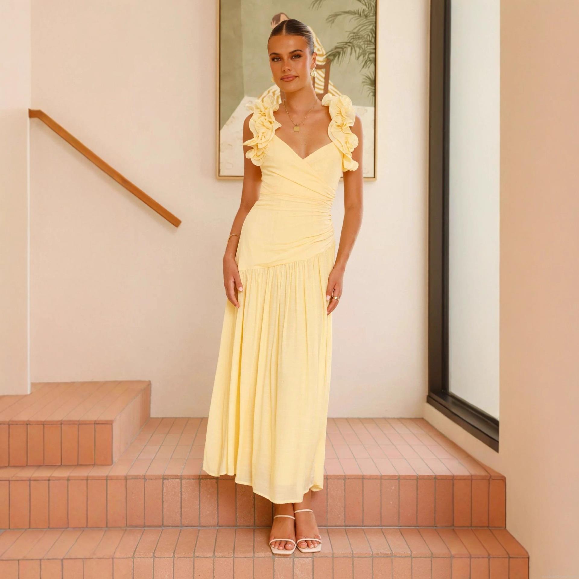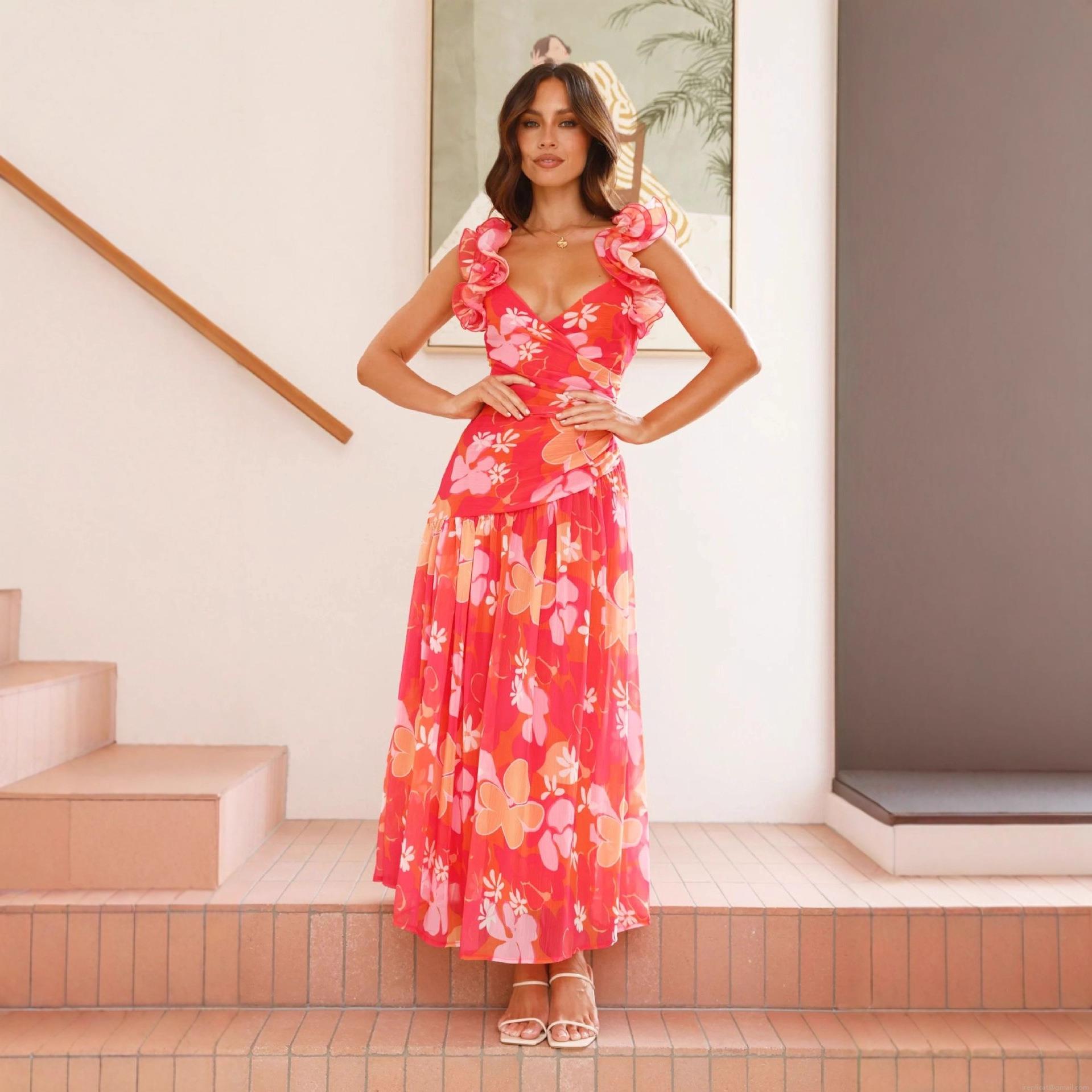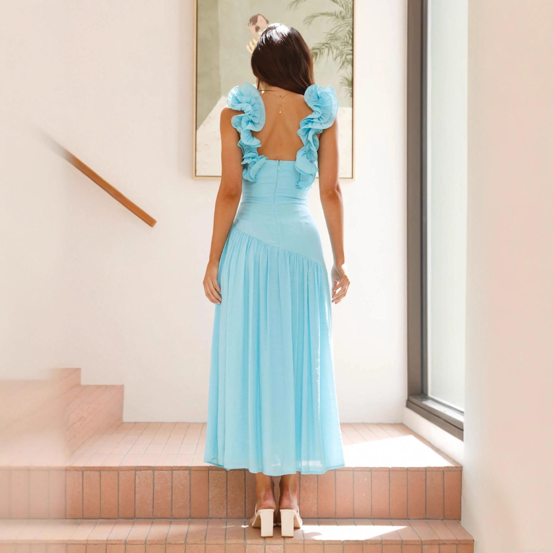 • Women Sexy V Neck Maxi Dress Sleeveless Ruffle Shoulder Backless High Waist Slit Pleated Floral Solid Summer Vacation Party Long Dress