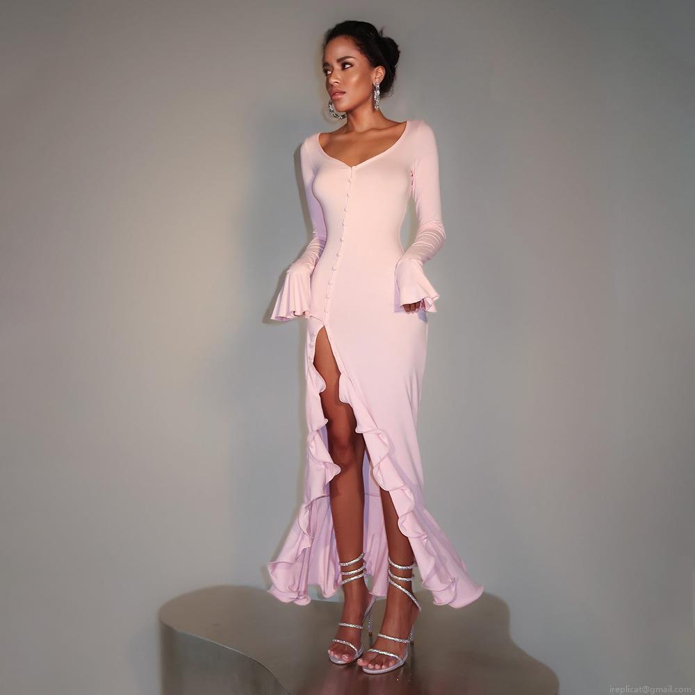 Women Sexy V Neck Side Slit Maxi Dress Milk Silk Polyester Long Flare Sleeve Ruffle Hem Button Down Solid Color Slim Fit Evening Party Clubwear Gown