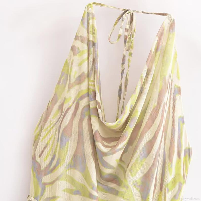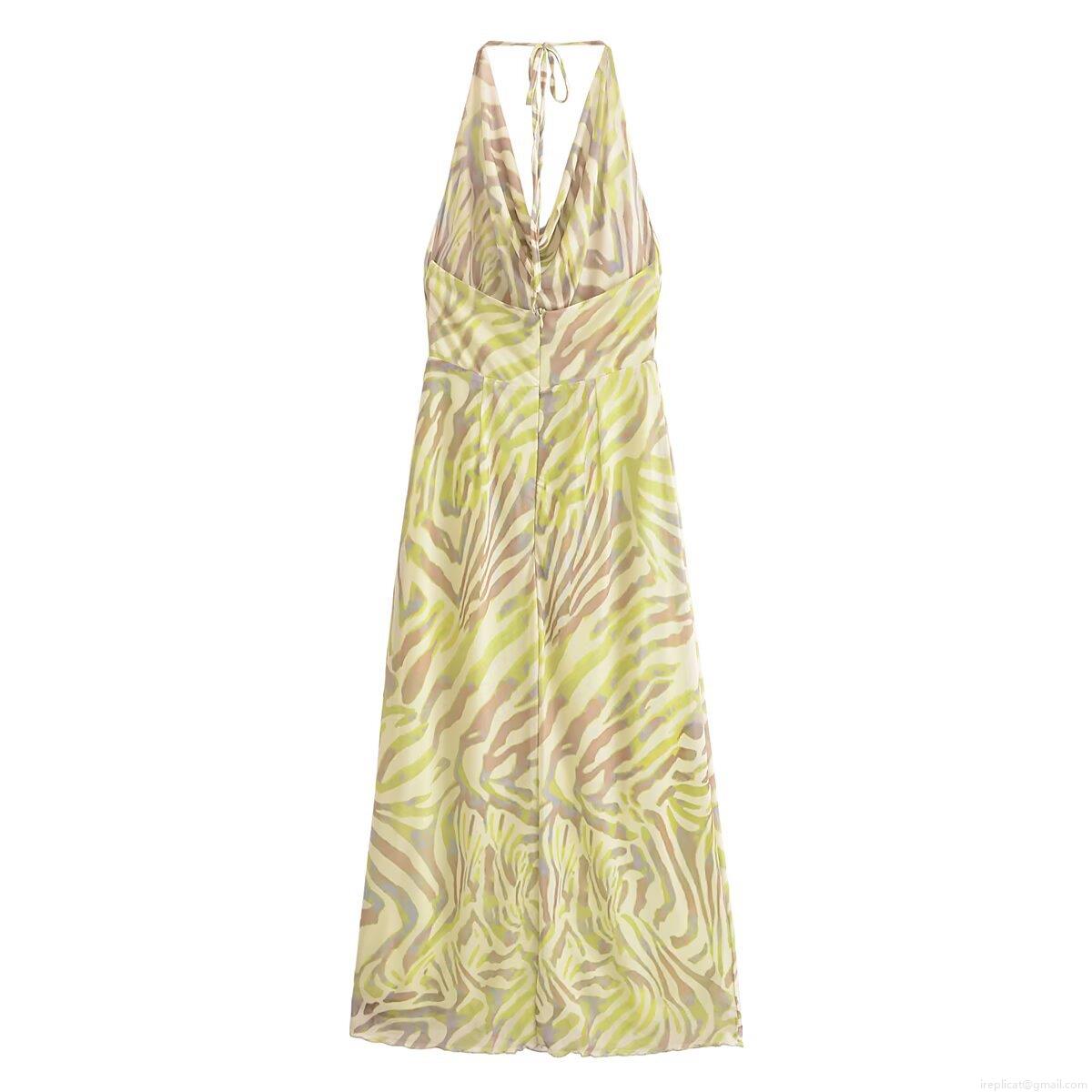 • Women Sexy Vacation Halter Maxi Dress Lime Green Zebra Print Lace-up Backless High Slit Long Dress Summer Beachwear Outfit