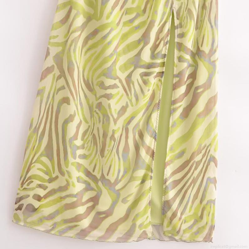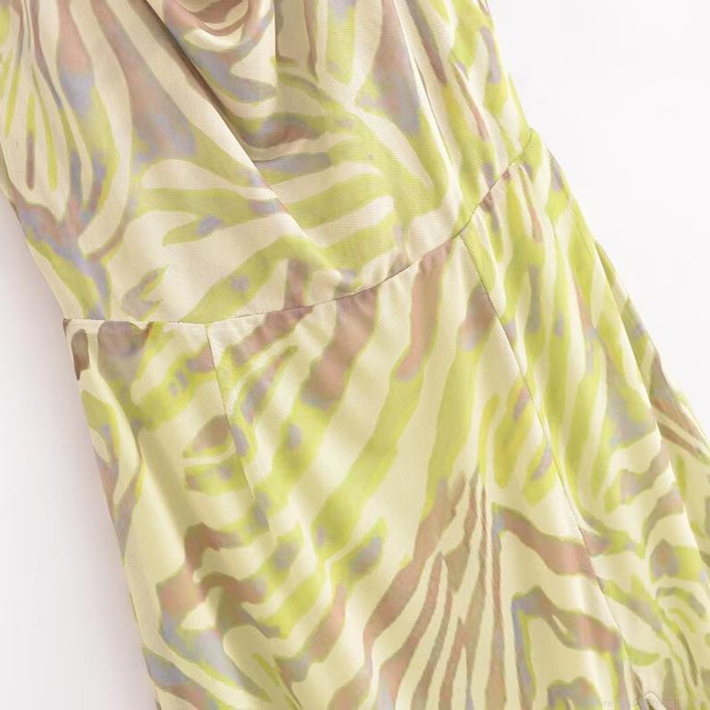 Women Sexy Vacation Halter Maxi Dress Lime Green Zebra Print Lace-up Backless High Slit Long Dress Summer Beachwear Outfit