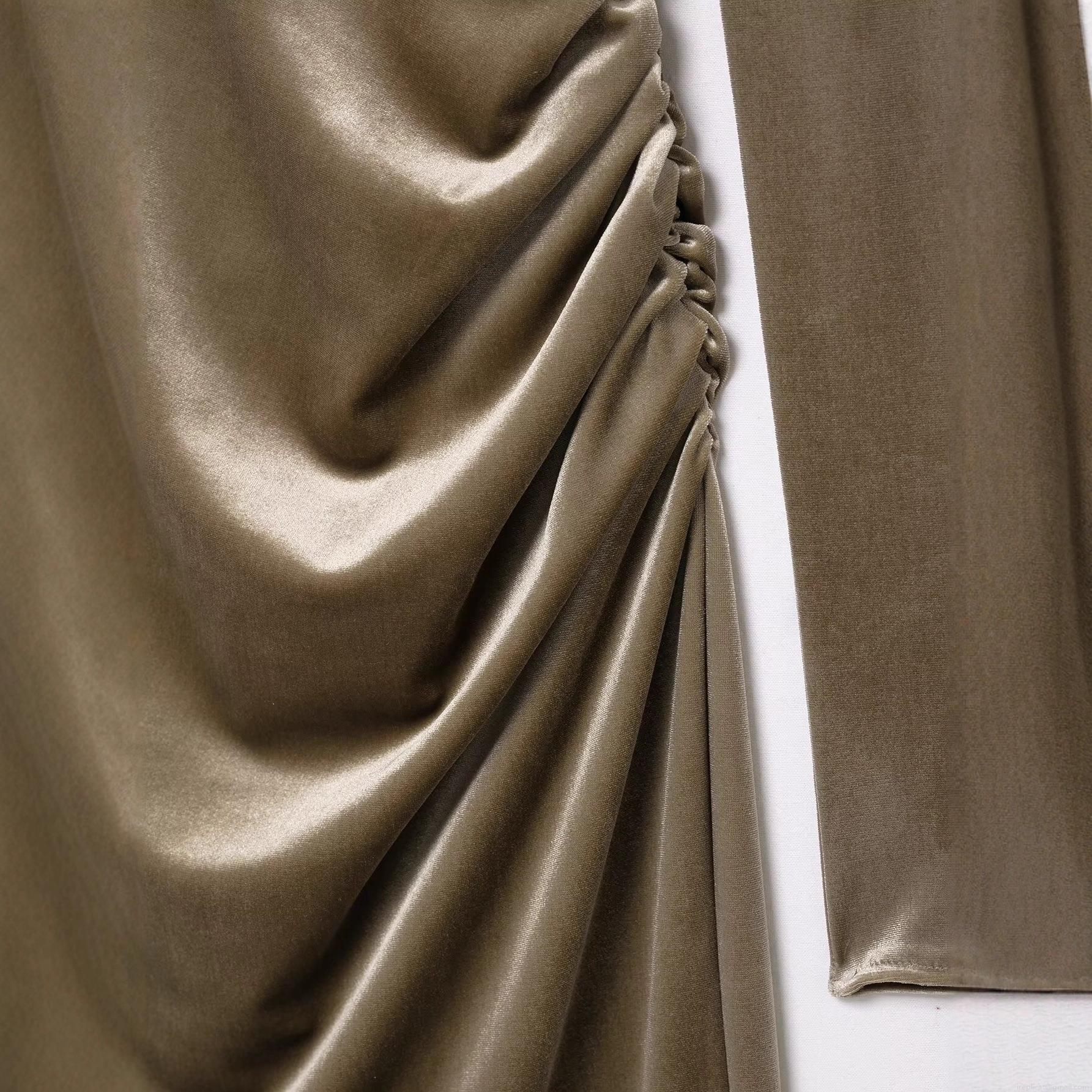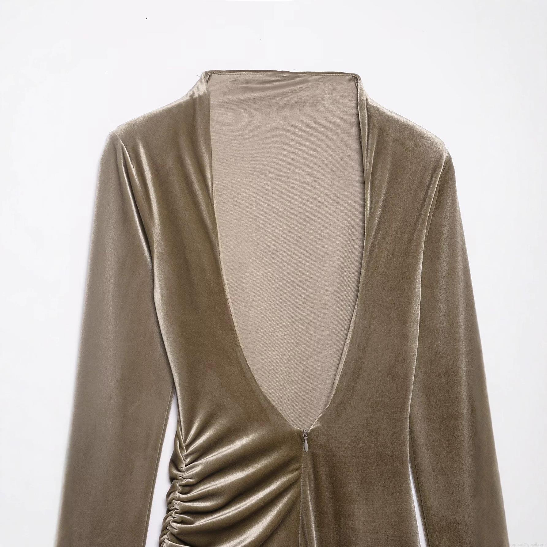 • Women Sexy Velvet Maxi Dress Ruched Open Back Semi-High Neck Long Sleeve Bodycon Evening Party Cocktail Dress For Ladies Autumn Winter Fashion Taupe