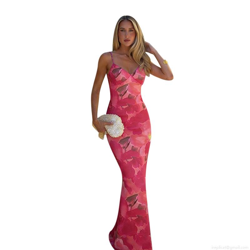 • Women Sexy V-Neck Floral Print Sling Maxi Dress Summer Beach Vacation Slim Fit High Waist Sleeveless Polyester Spandex Long Dress