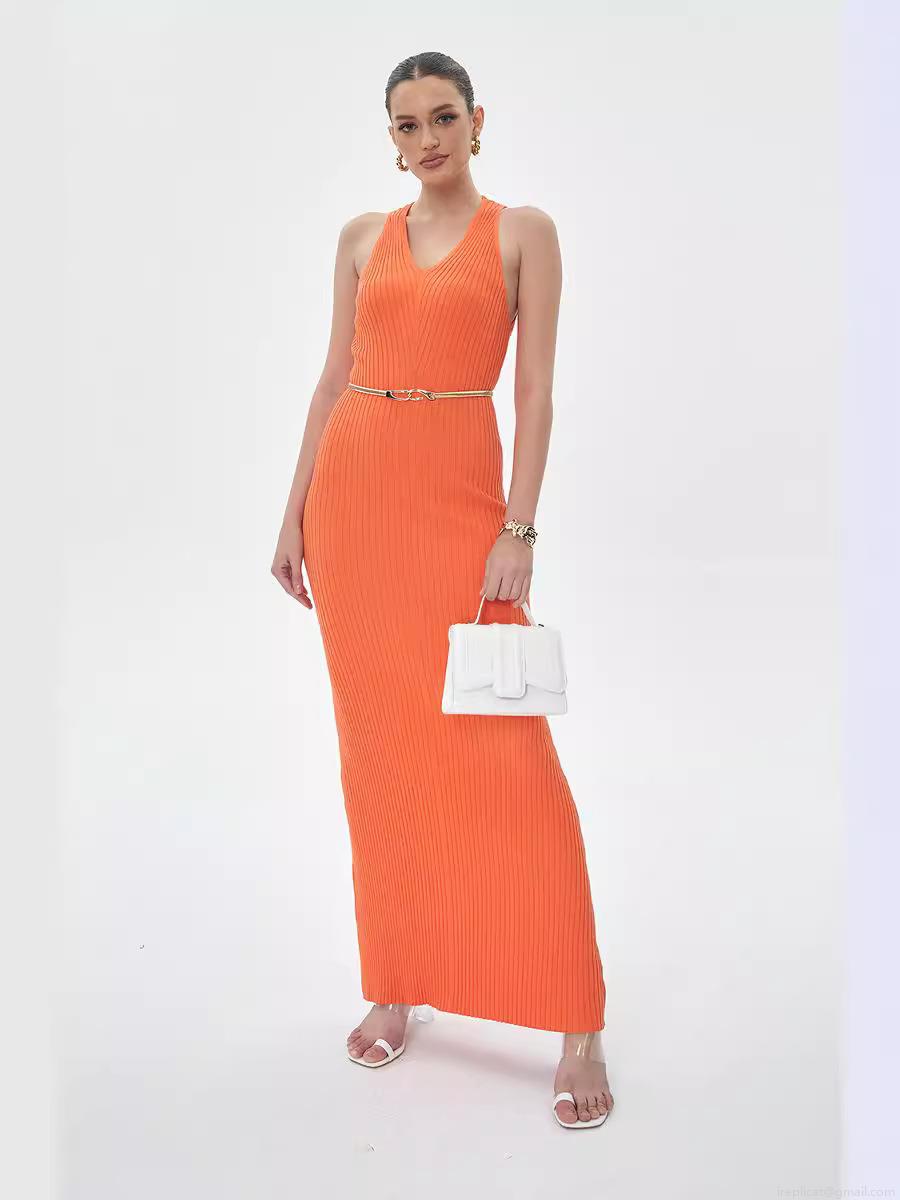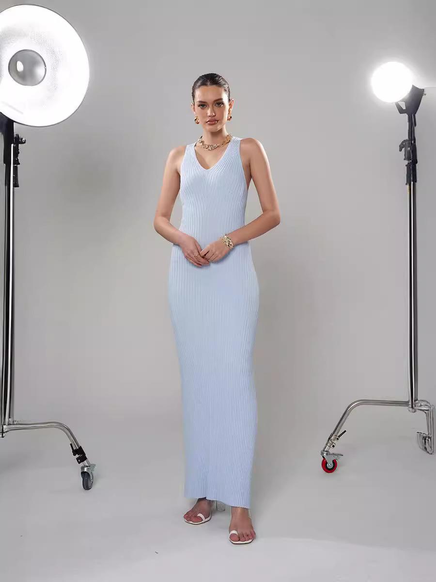 • Women Sexy V-Neck Sleeveless Ribbed Knit Maxi Dress Slim Fit Solid Color Bodycon Long Dress Elegant Summer Beach Streetwear Clubwear Party Gowns