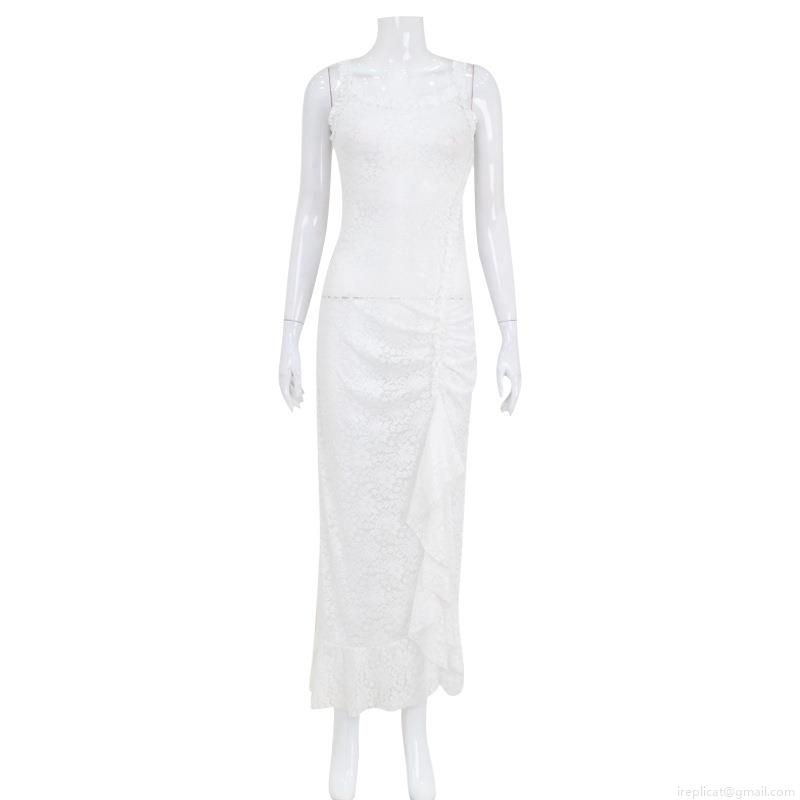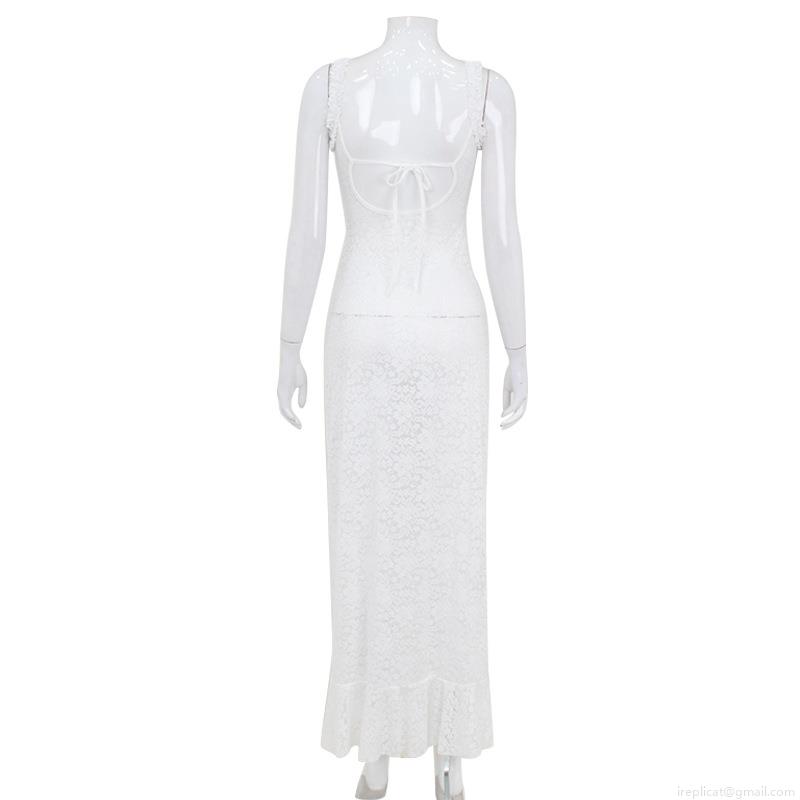 • Women Sexy White Lace Maxi Dress Backless See-Through High Split Spaghetti Strap Ruffle Long Dress Elegant Party Club Evening Vacation Dress