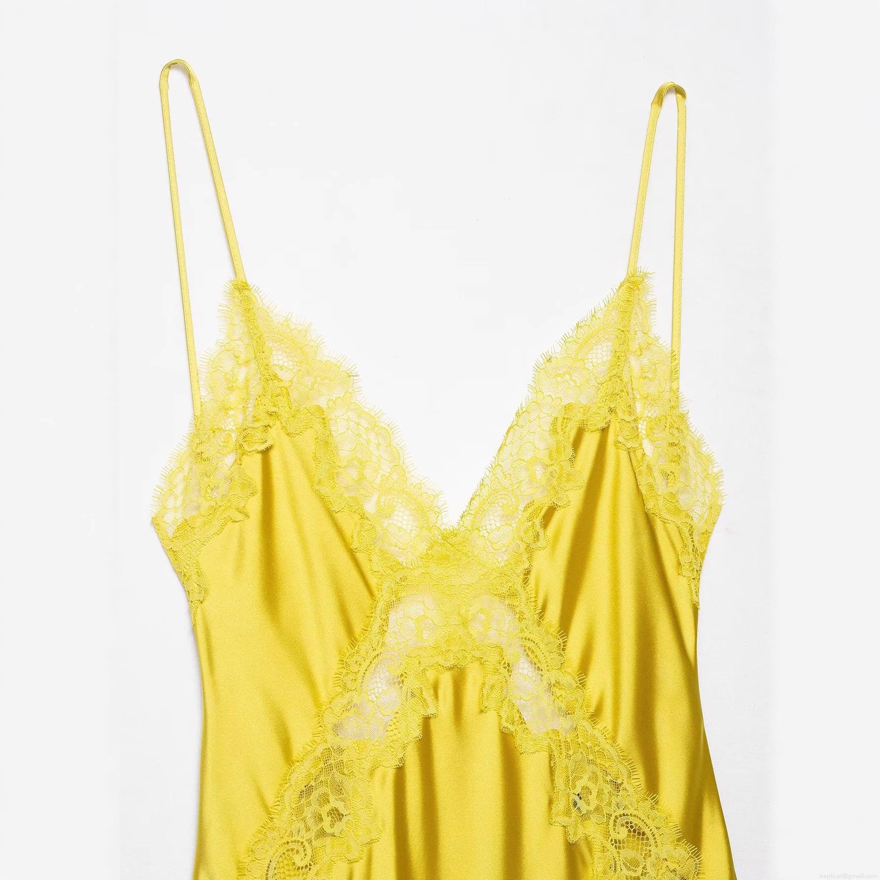 • Women Sexy Yellow Lace Satin Maxi Cami Dress Elegant V-Neck Sleeveless Silk Texture Long Dress For Vacation Party Evening Wear
