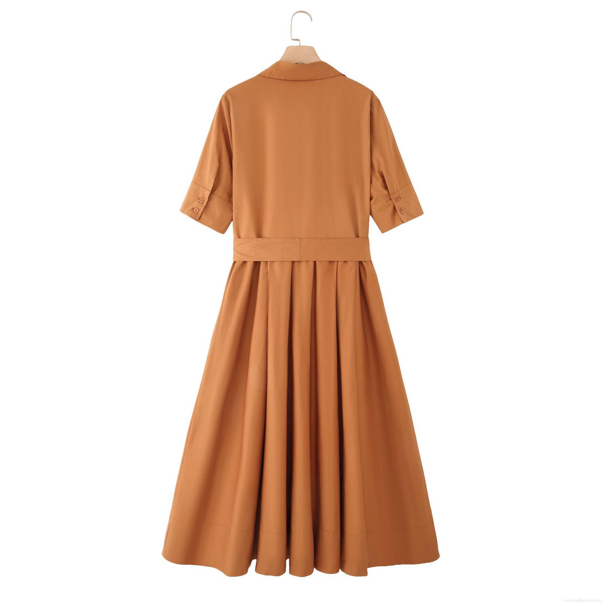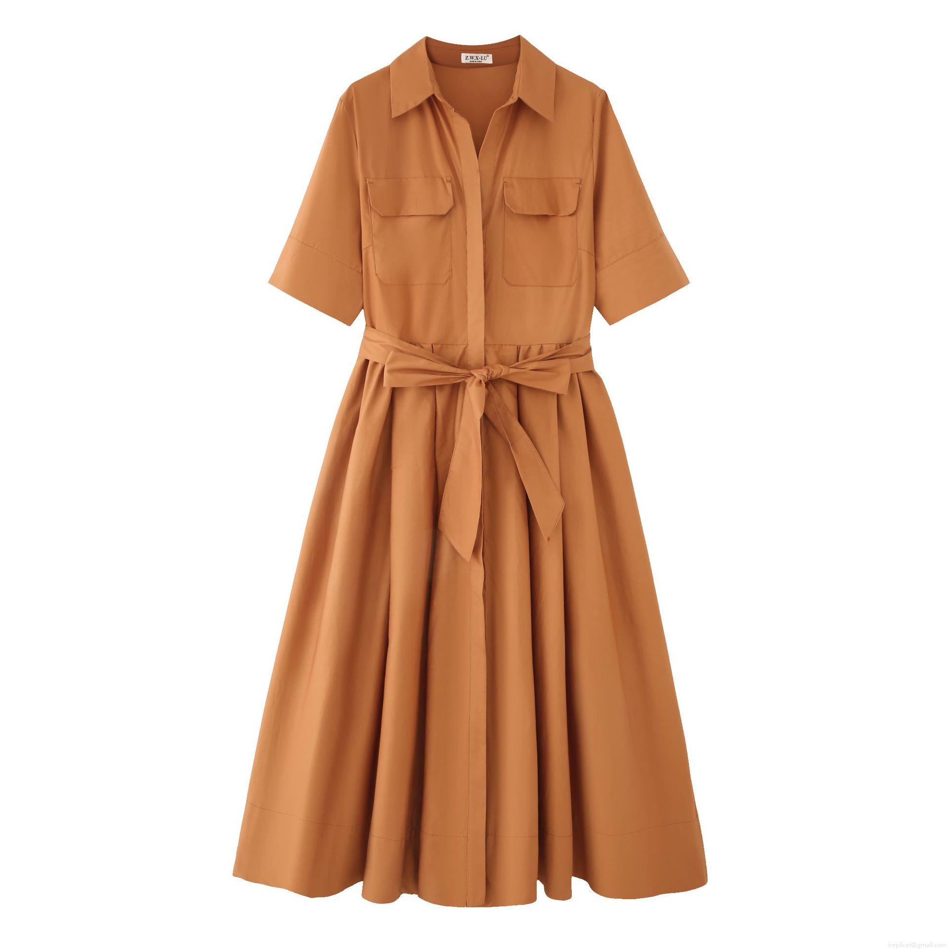 • Women Short Sleeve Shirt Dress 100% Cotton Button Up Maxi Dress With Belt Elegant Solid Color Lapel Neck Gown With Chest Pockets For Summer Casual Wear