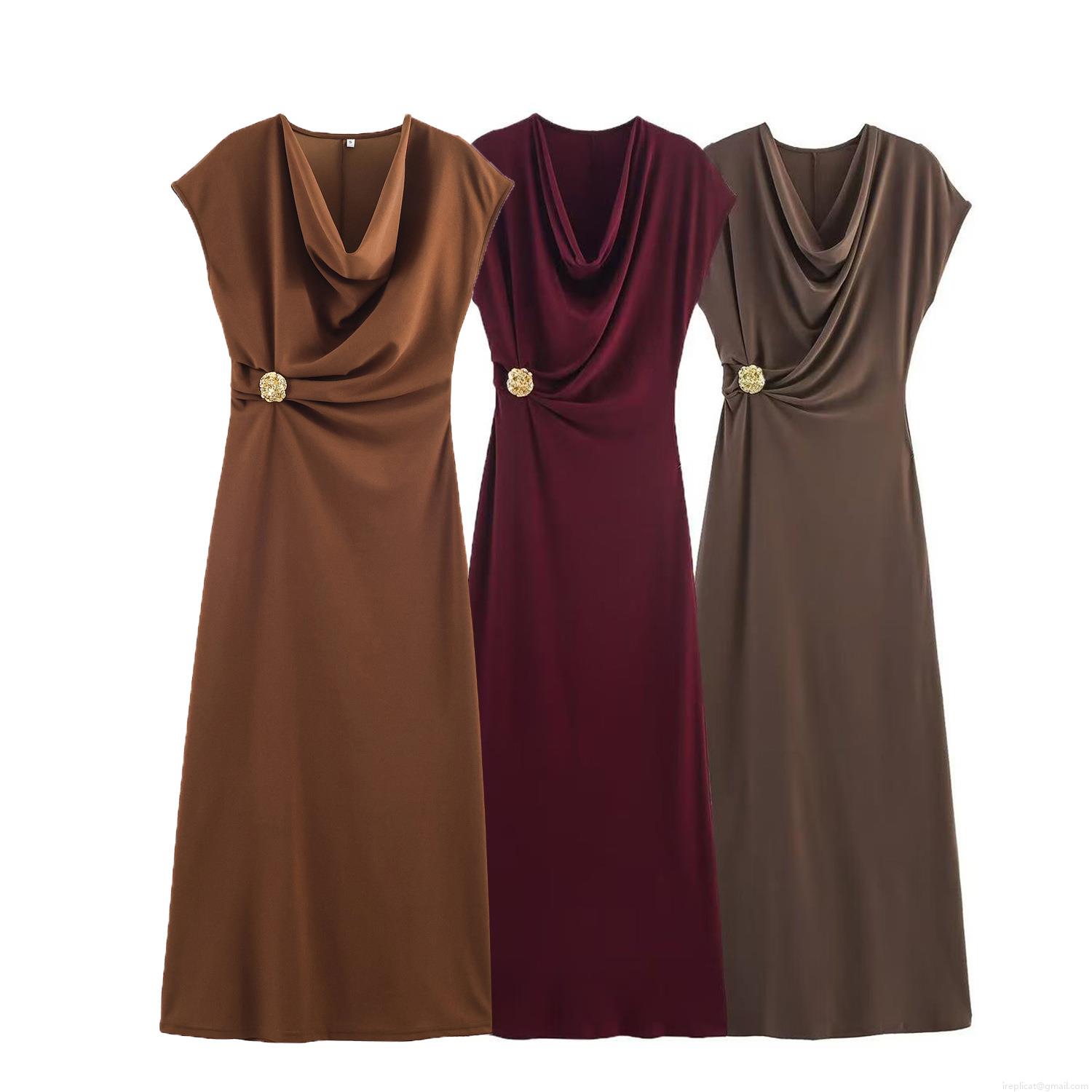 • Women Sleeveless Cowl Neck Maxi Dress Elegant Slim Fit Pleated Knit Evening Party Long Dress With Gold Metal Buckle Sexy Cocktail Gown