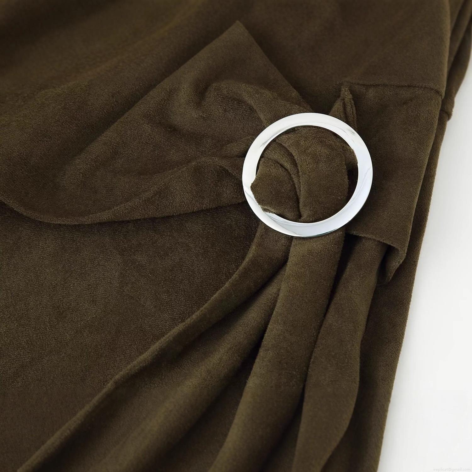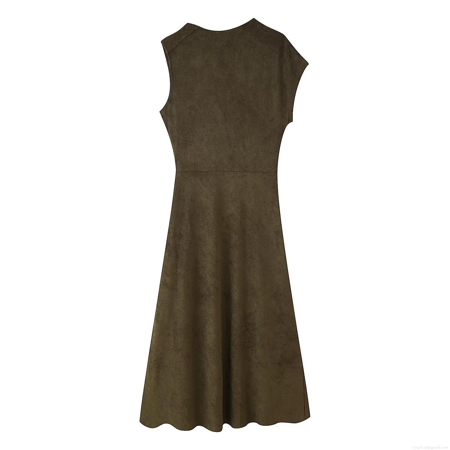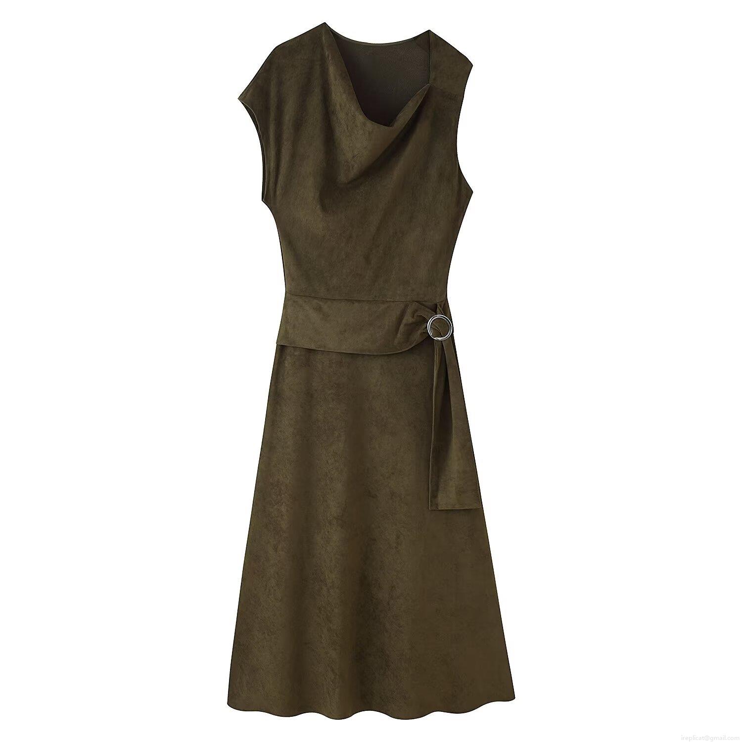 • Women Sleeveless Faux Suede Maxi Dress With Metal Ring Belt Asymmetrical Hem Crew Neck Sexy Bodycon Long Dress For Party Clubwear