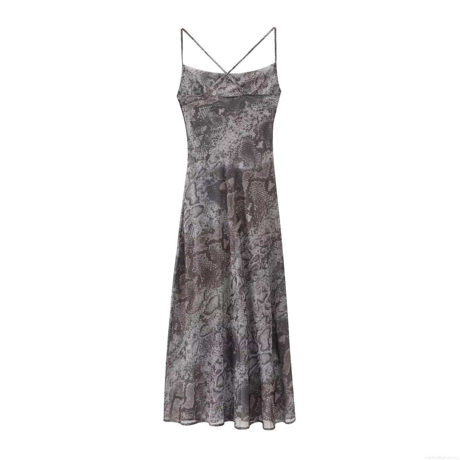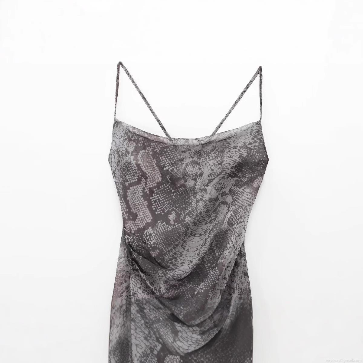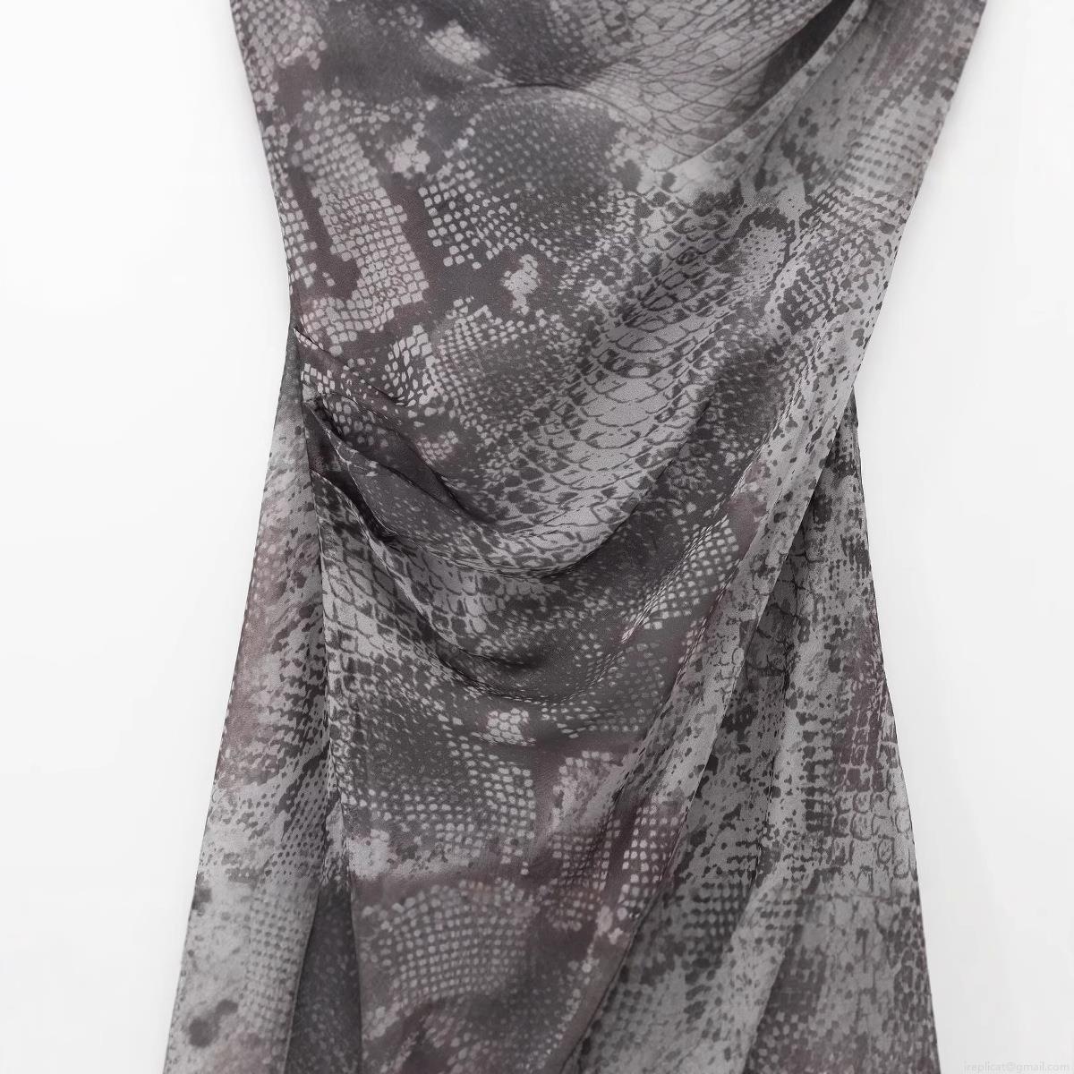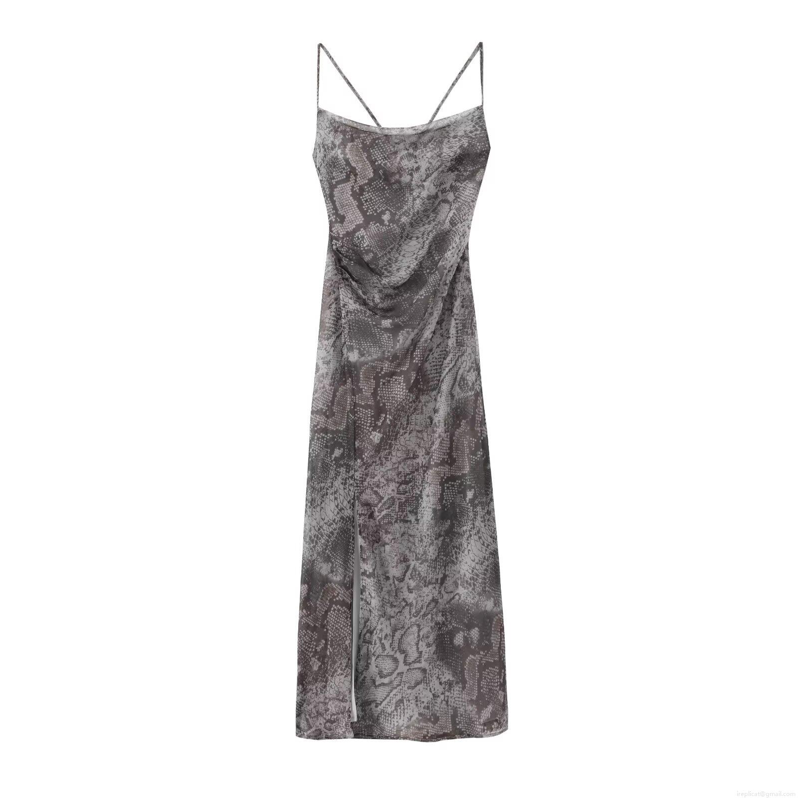 Women Snake Skin Print Slip Maxi Dress Elegant Sleeveless Chiffon Draped Neck Side Slit Evening Party Club Long Dress