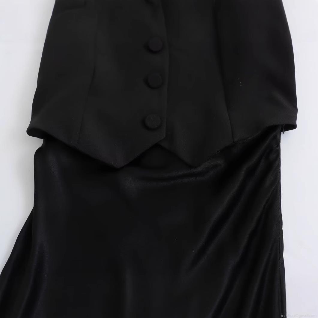 • Women Spliced Satin Maxi Dress V Neck Sleeveless Single Breasted Waistcoat Style Long Dress For Summer Party Evening Streetwear Chic