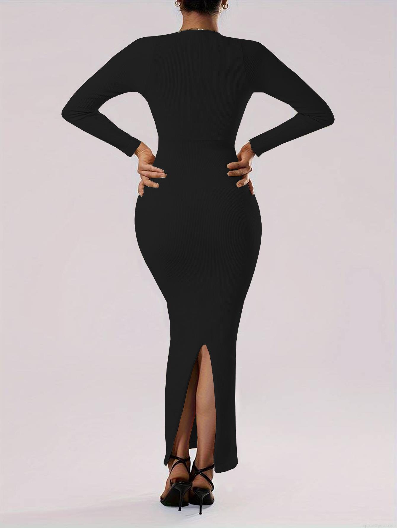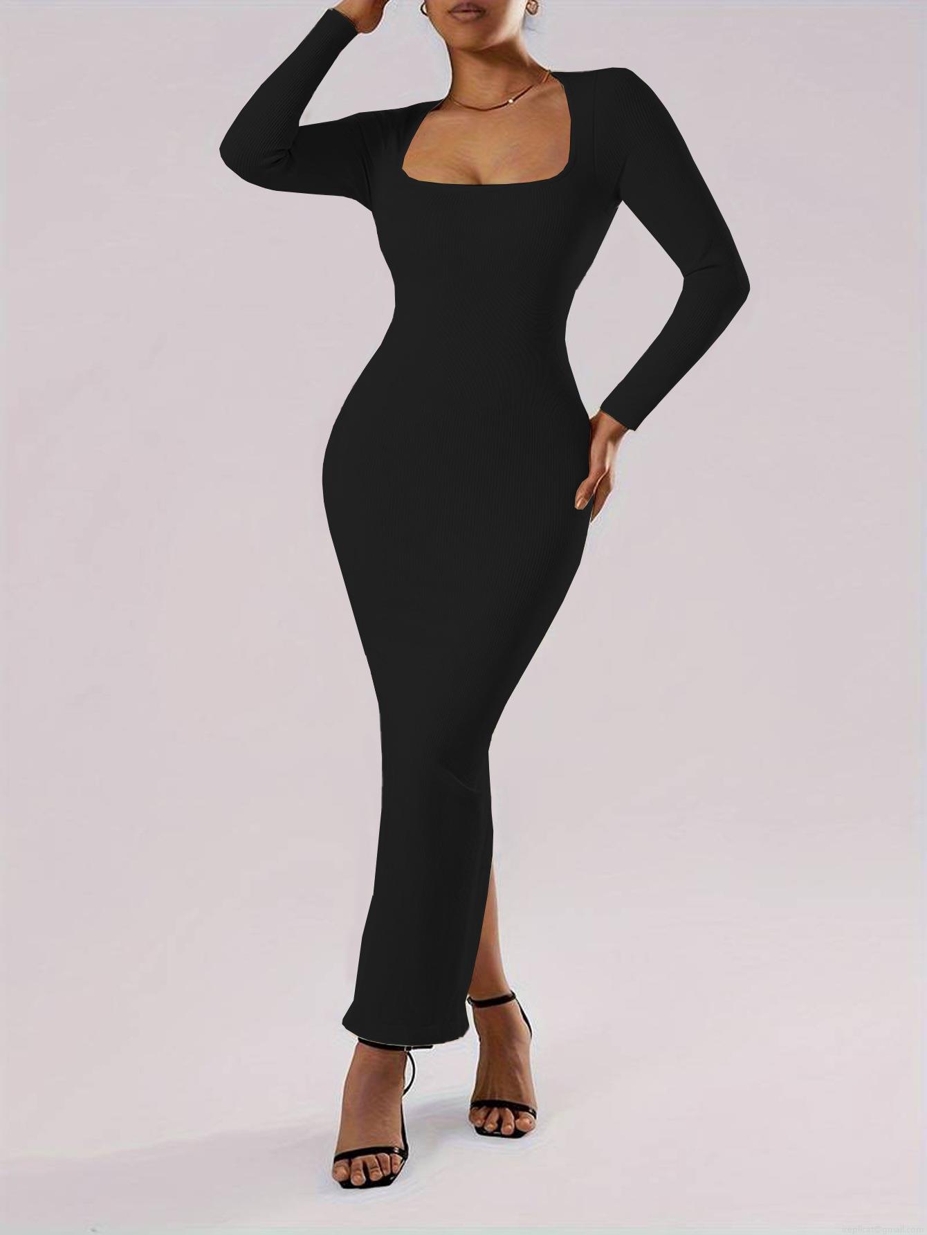 • Women Square Neck Long Sleeve Ribbed Knit Maxi Dress Sexy Bodycon Slim Fit Ankle Length Back Split Autumn Winter Party Clubwear Dress