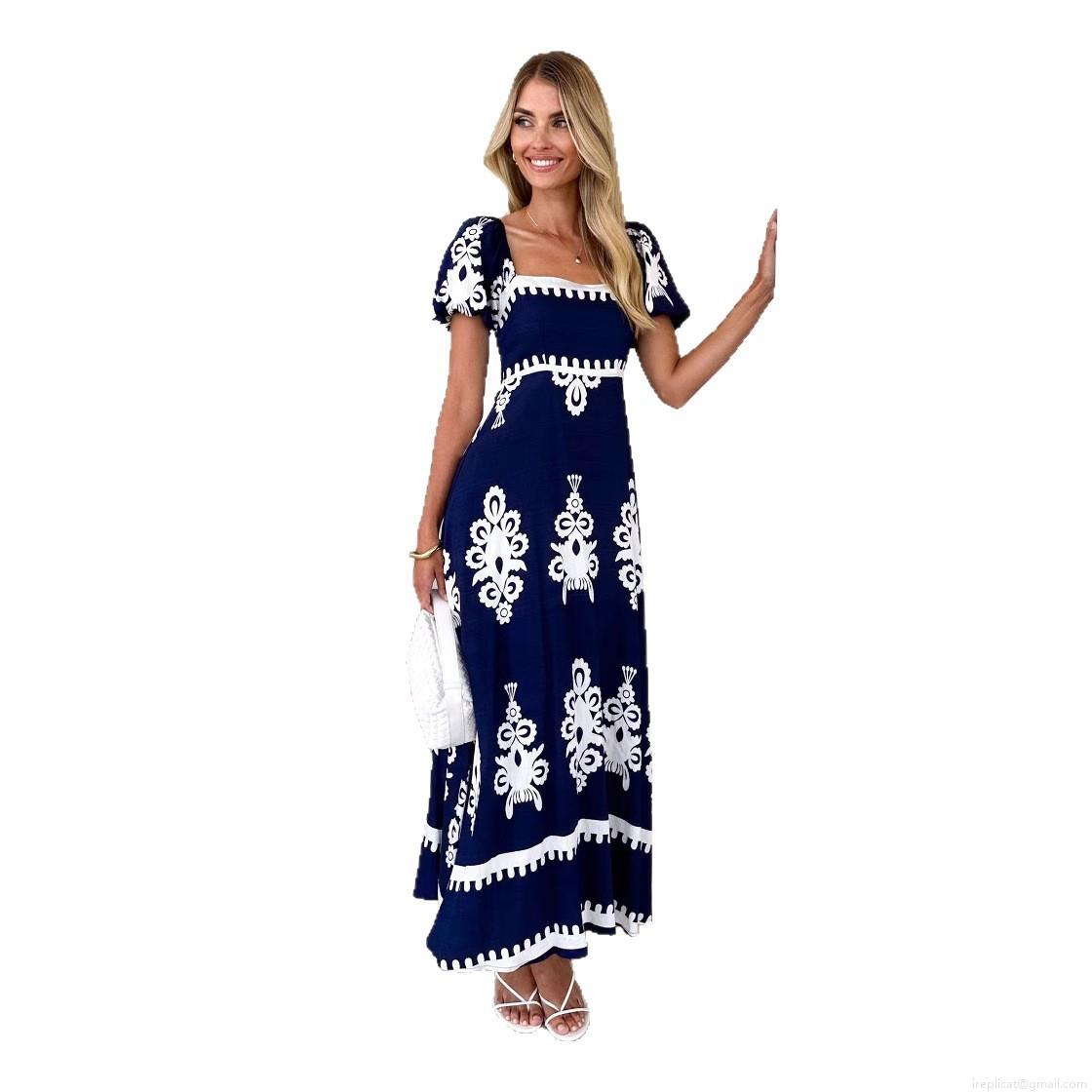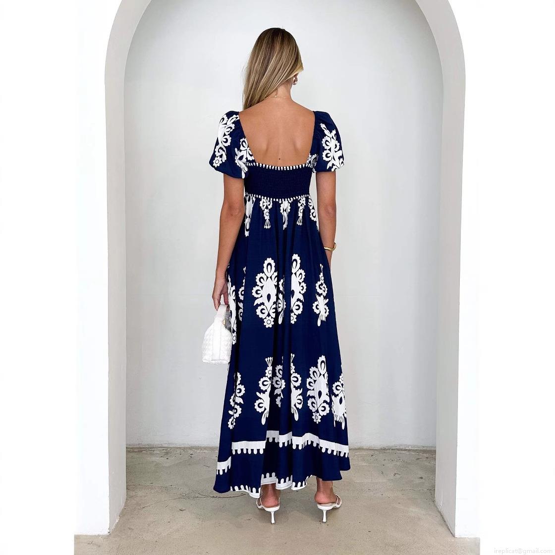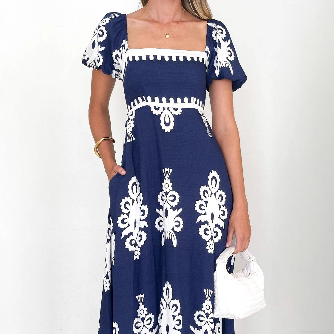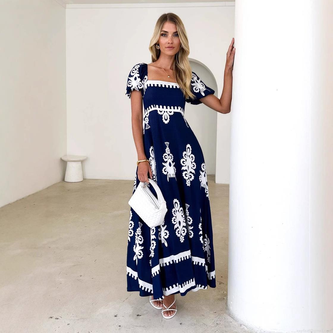 • Women Summer Bohemian Maxi Dress Square Neck Puff Short Sleeve Ethnic Geometric Print High Waist A-Line Long Dress For Vacation Beach Party