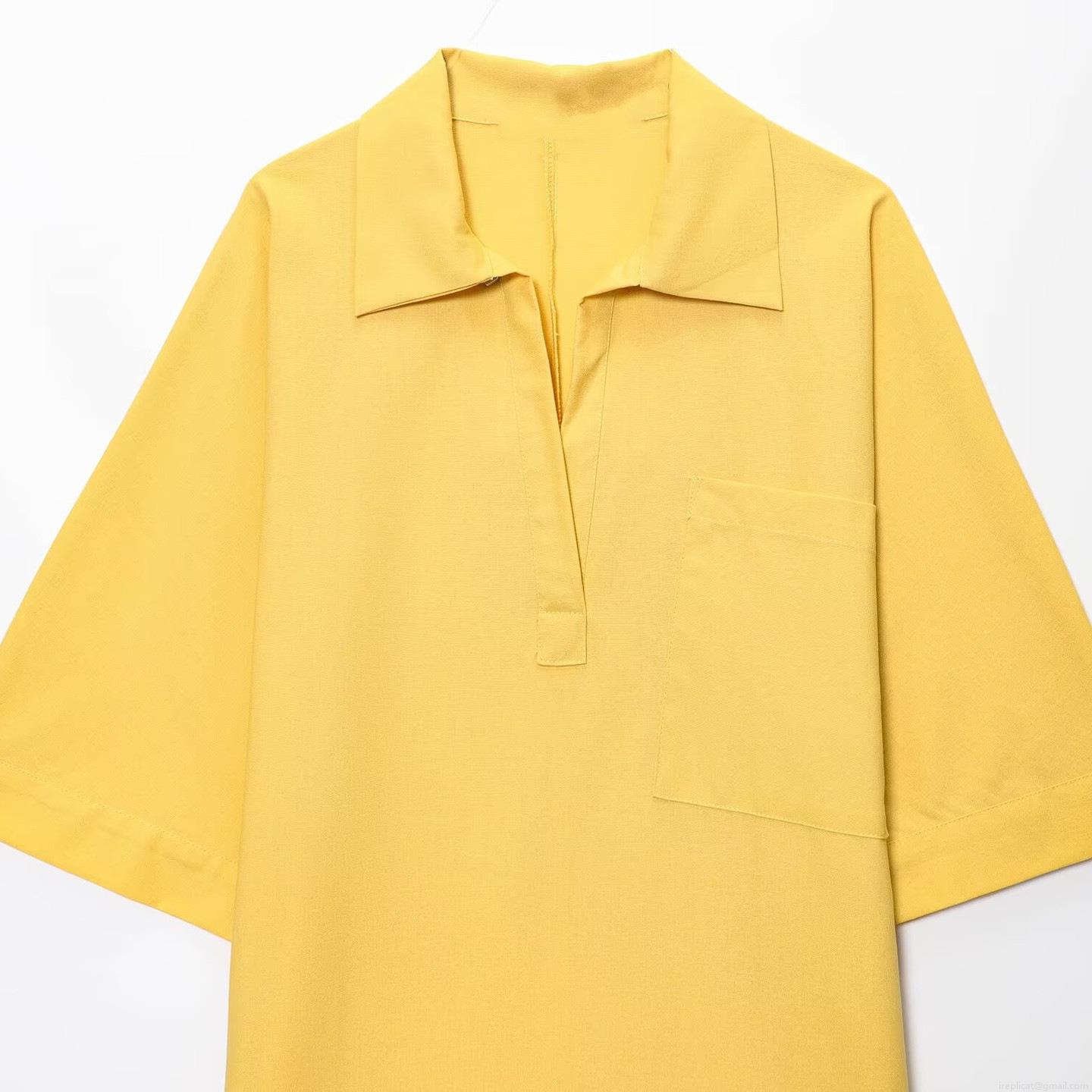 • Women Summer Casual Cotton Linen Blend Maxi Dress Polo Collar Short Sleeve V Neck Loose Fit Patch Pocket Vacation Solid Color Long Shirt Dress