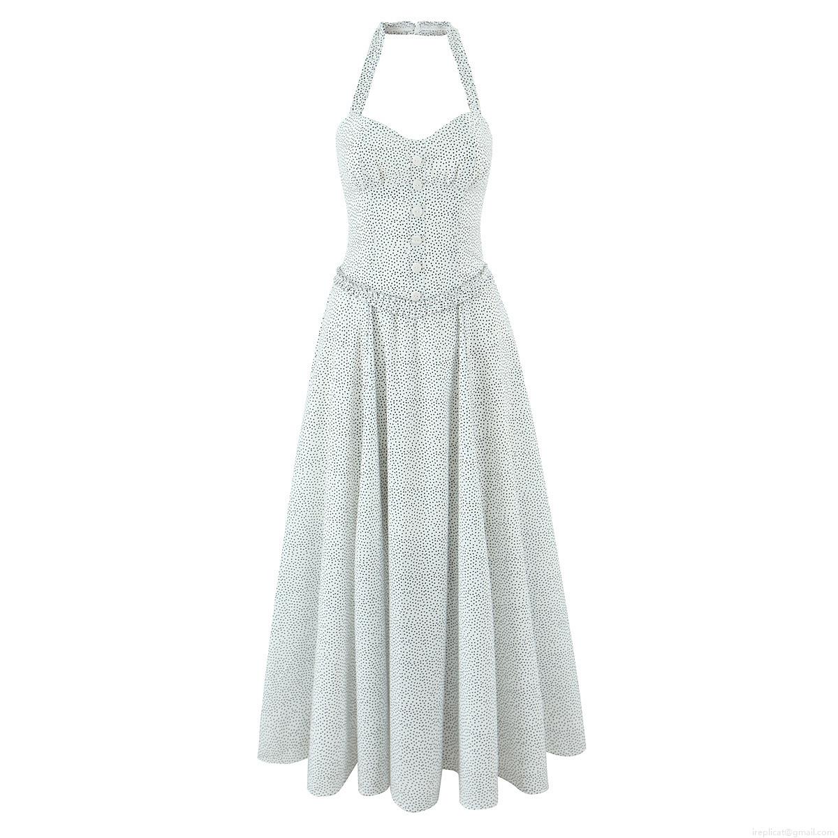 • Women Summer Halter Neck Backless A-Line Maxi Dress Cotton Blend Polka Dot Floral Print Button Decor Tie-Back Long Sundress For Party Vacation