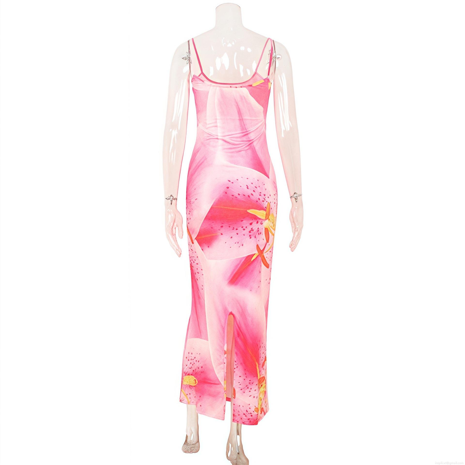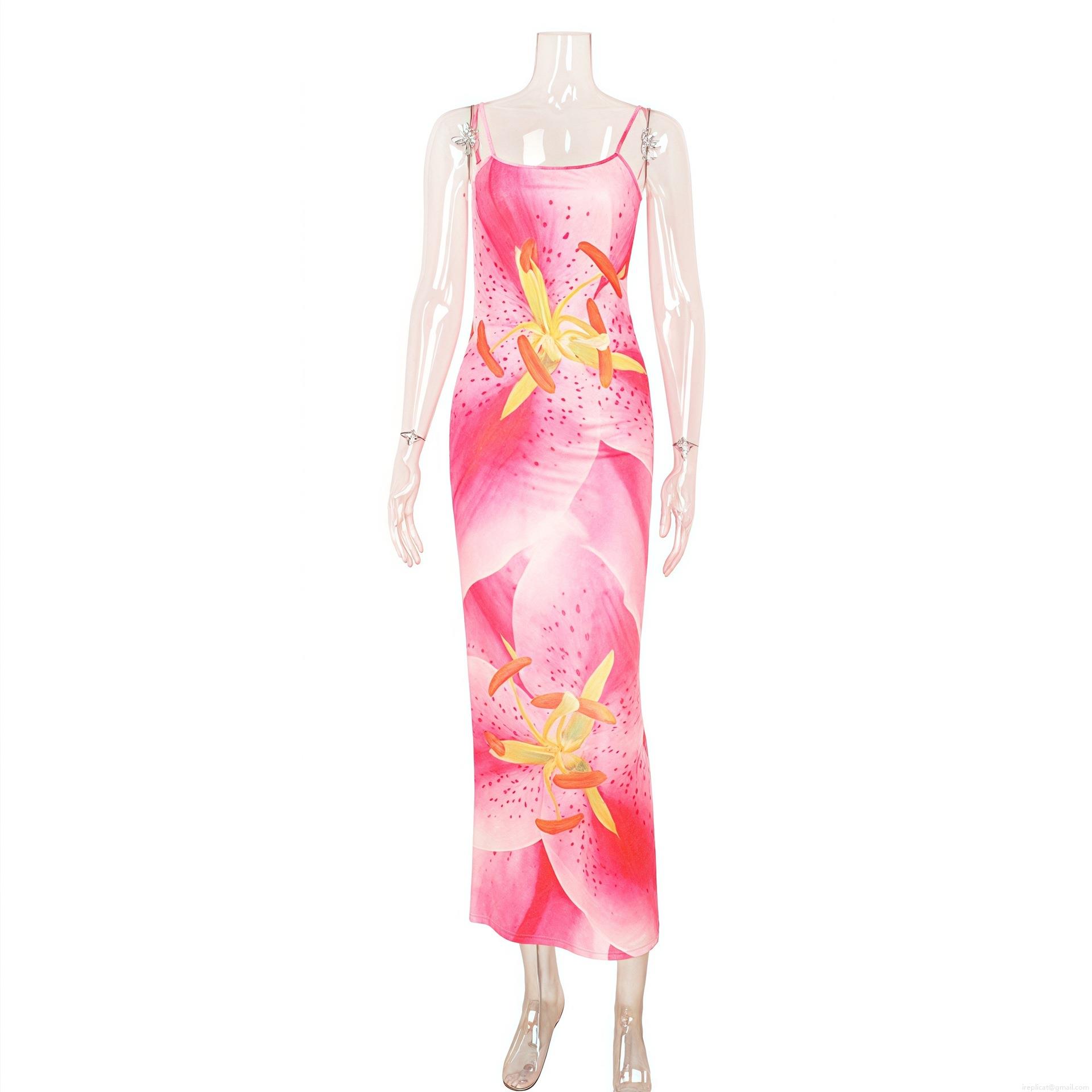 • Women Summer Pink Lily Floral Print Cami Maxi Dress Sleeveless High Waist Slim Fit Polyester Spandex Long Holiday Dress