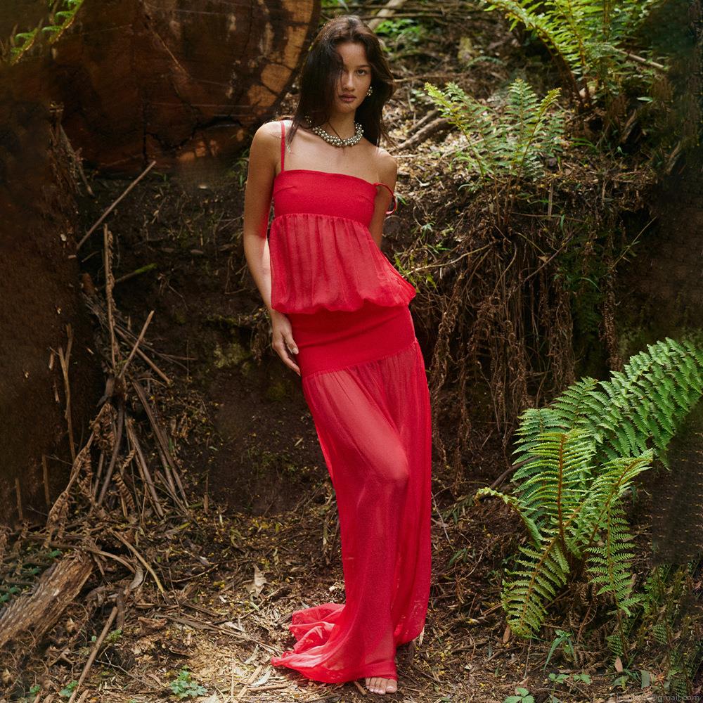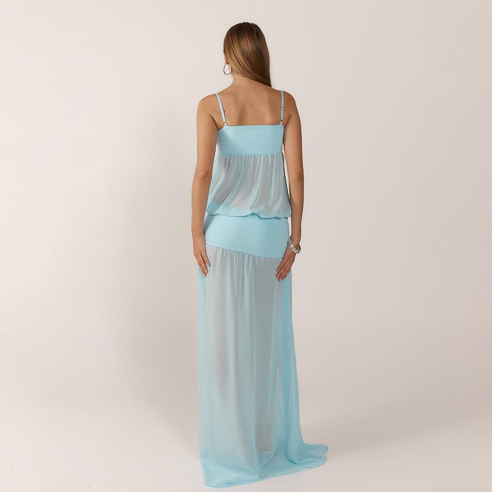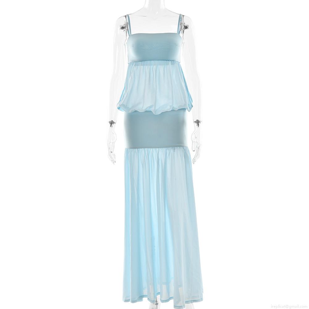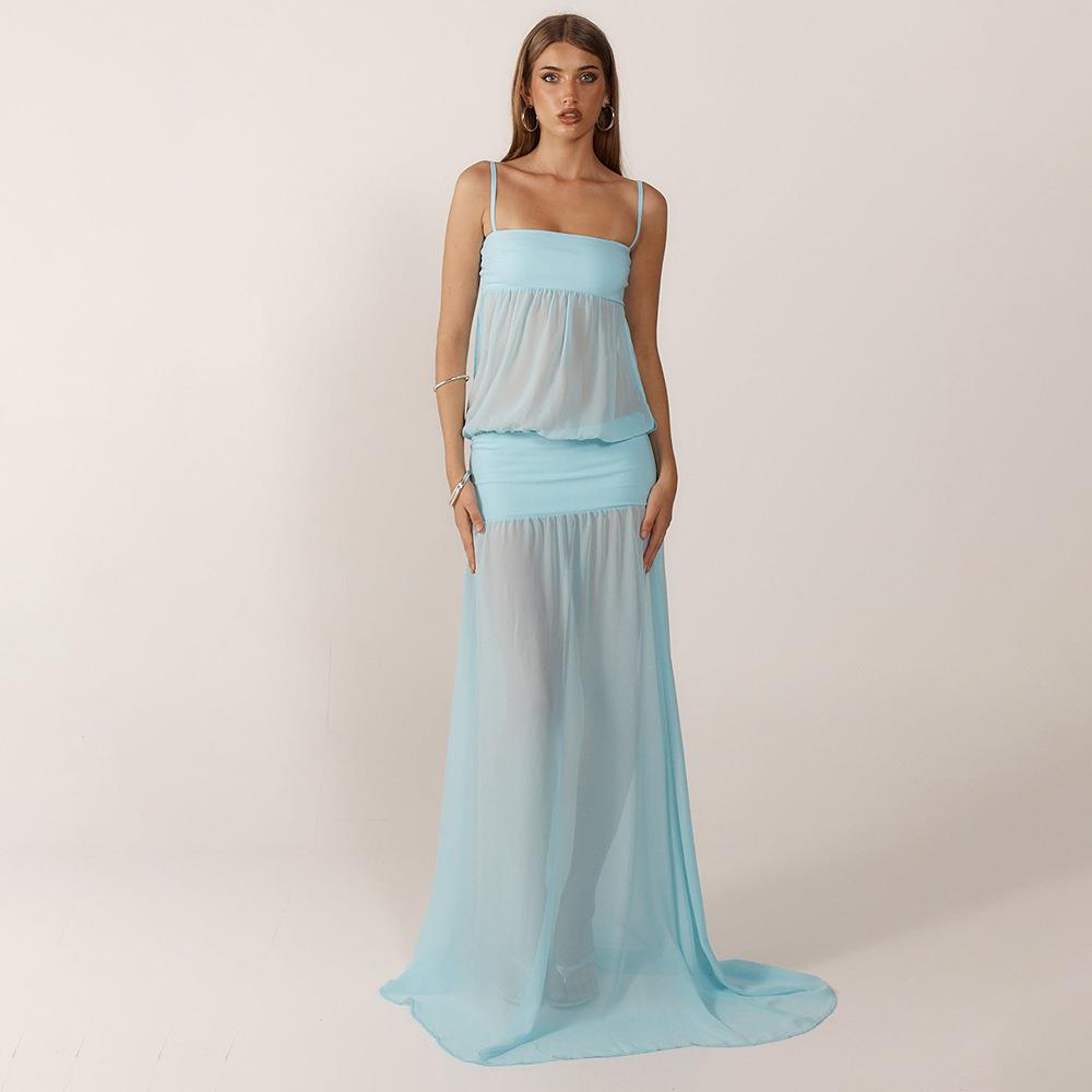 • Women Summer Sexy Maxi Dress Mesh Patchwork Sheer Camisole Backless High Waist Slim Fit Polyester Spandex Long Dress For Party Vacation Evening Beach