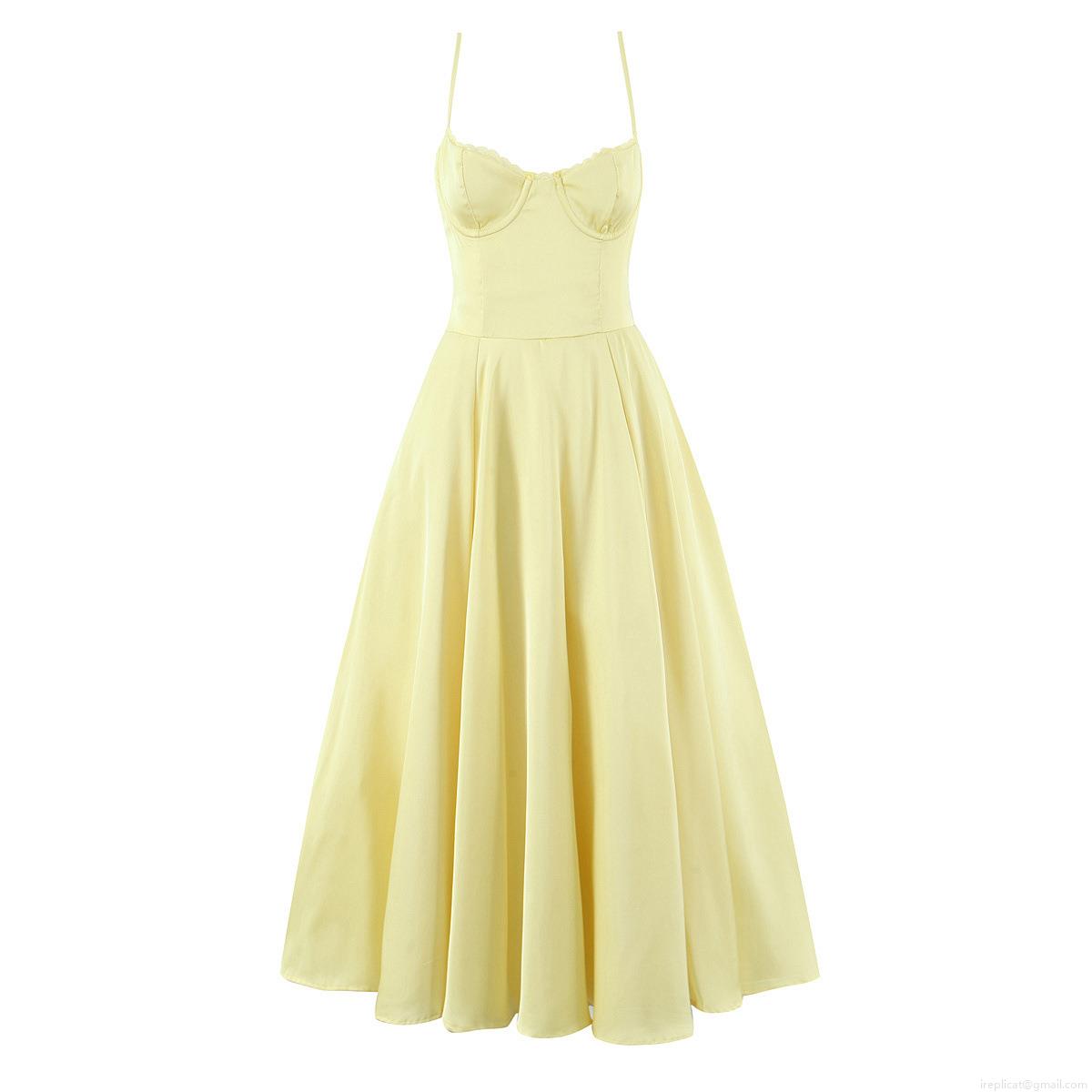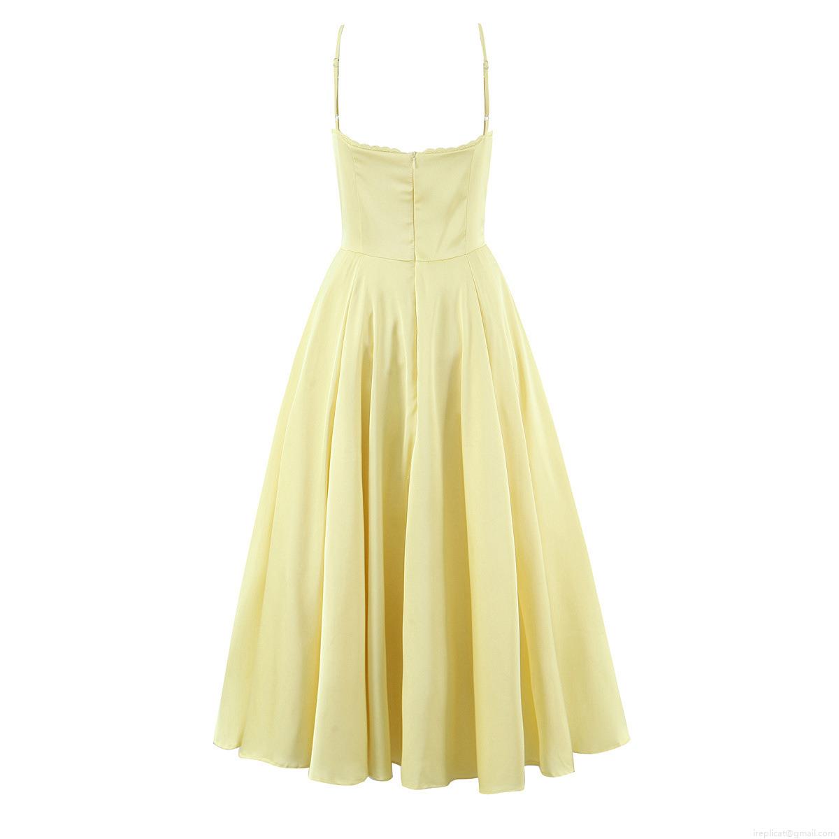 Women Summer Sexy Satin Yellow Corset Strappy Maxi Dress Backless V-Neck Large Swing Lace Trim Long Dress For Party Vacation