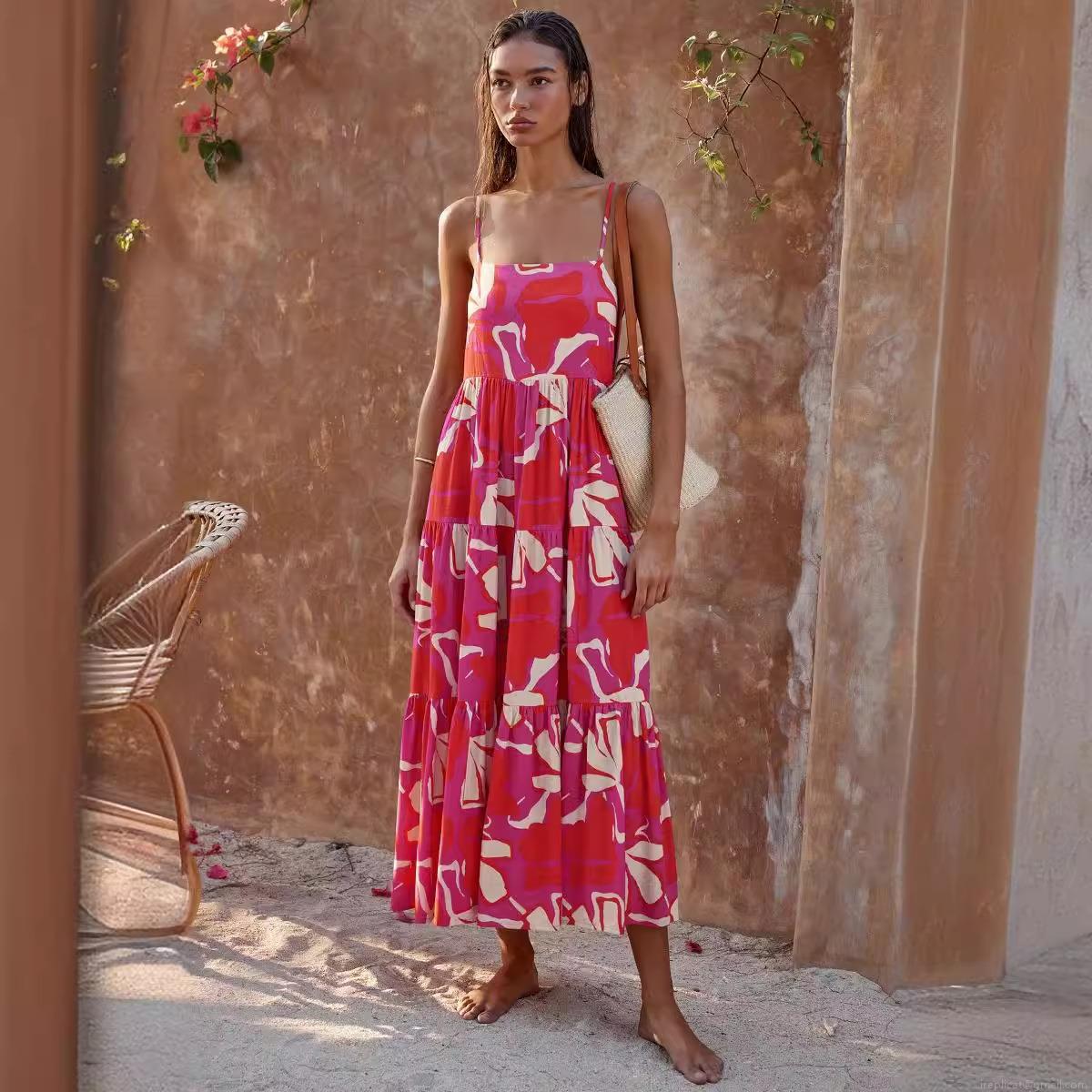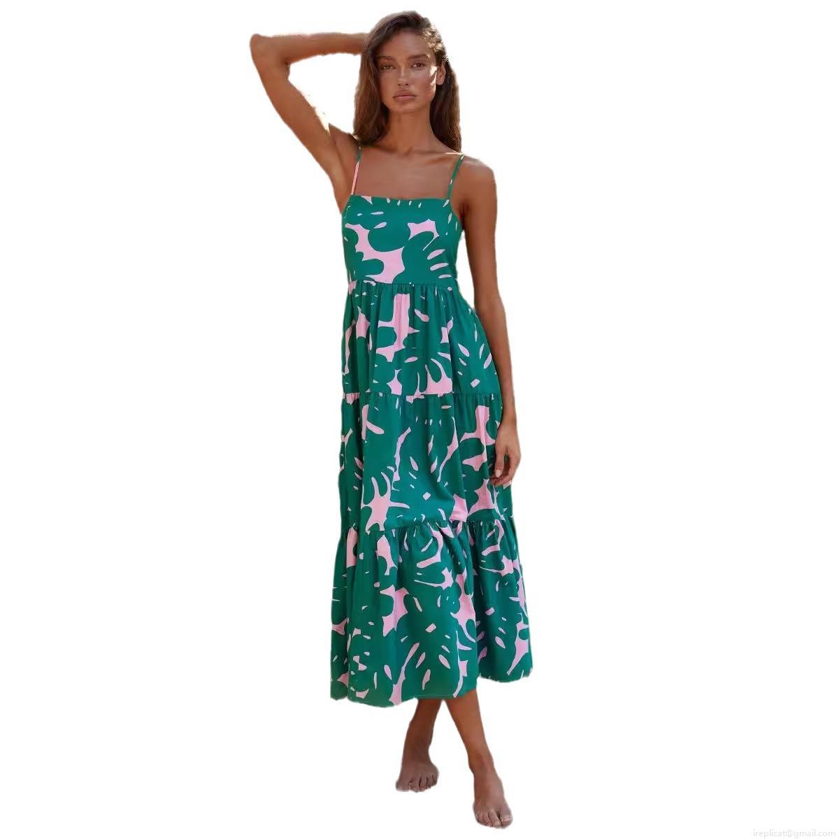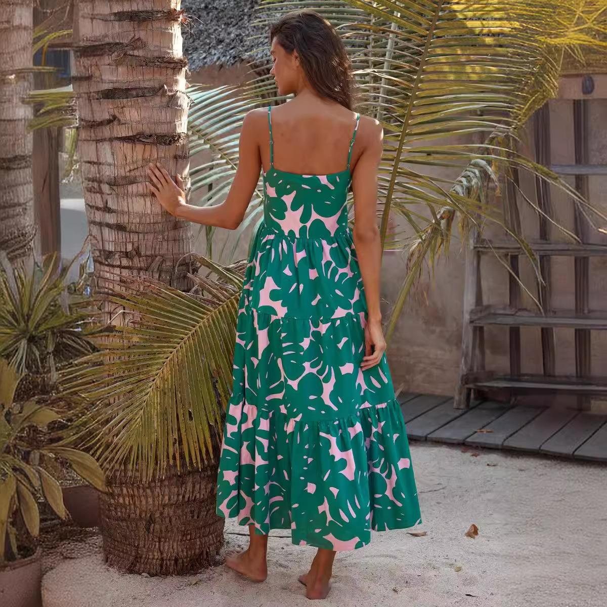 • Women Summer Tropical Leaf Print Maxi Dress Polyester Backless Tiered A-Line Slip Dress Bohemian Resort Beachwear Vacation Long Gown
