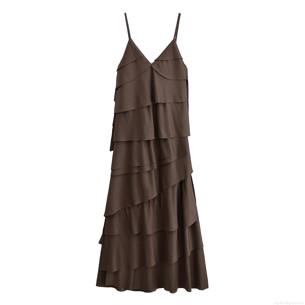 • Women Tiered Maxi Dress Polyester Sleeveless V-Neck Cami Sling Long Dress For Summer Vacation Elegant Solid Color Layered Ruffle Cake Skirt Ladies Clothing