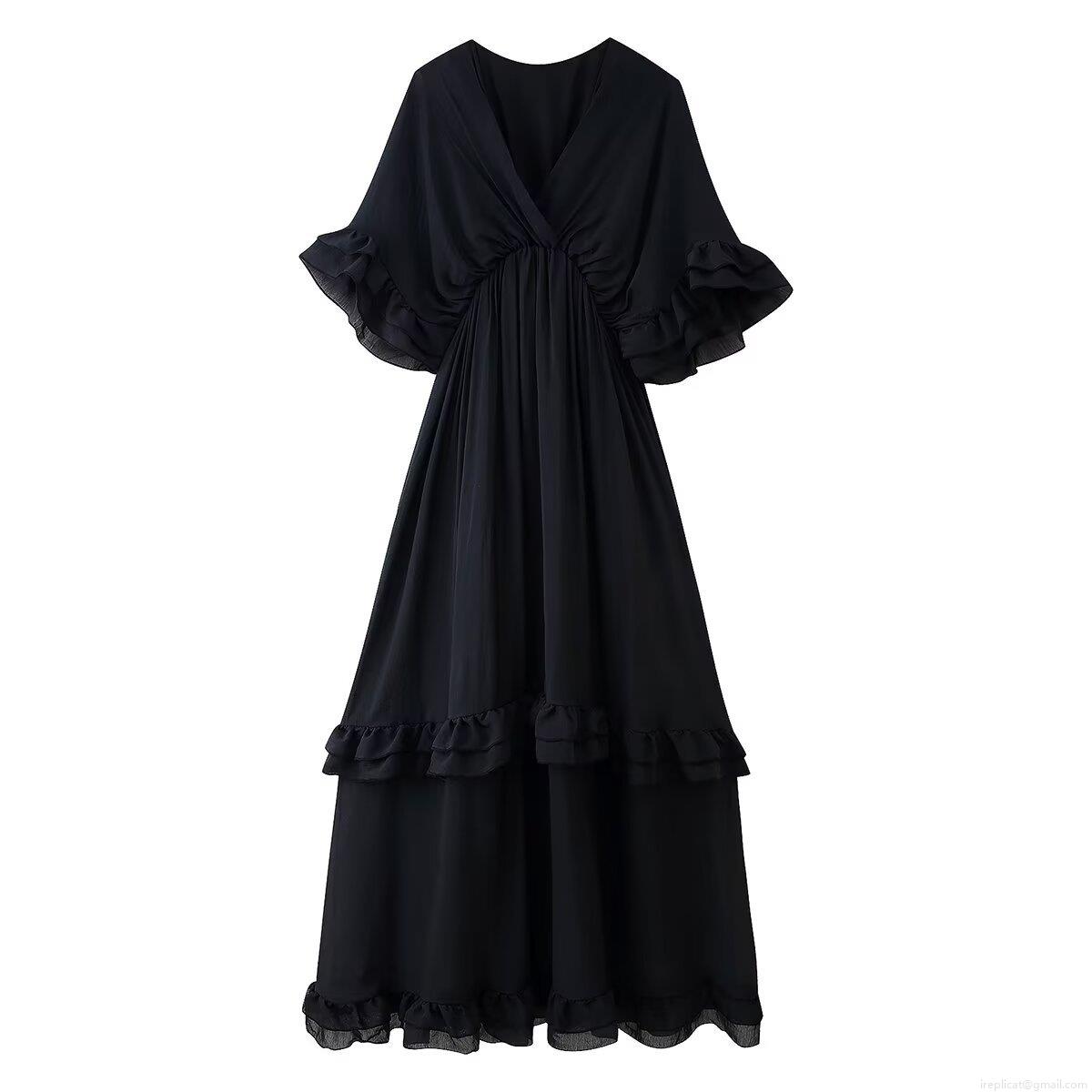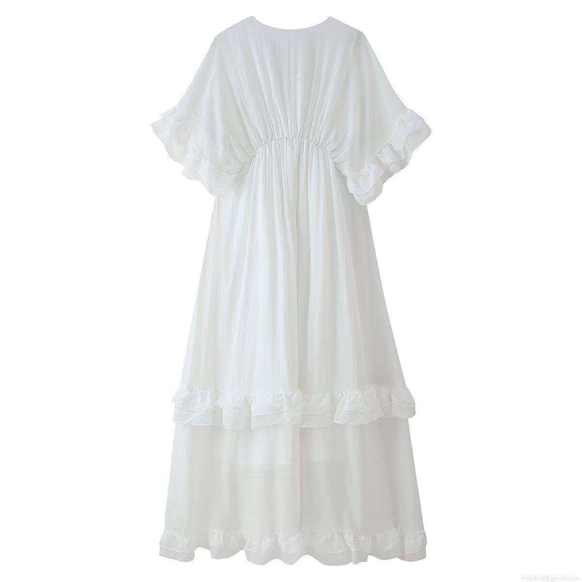 • Women V Neck Ruffle Short Sleeve Maxi Dress Elegant Solid Color Layered A-Line Long Dress For Summer Party Vacation