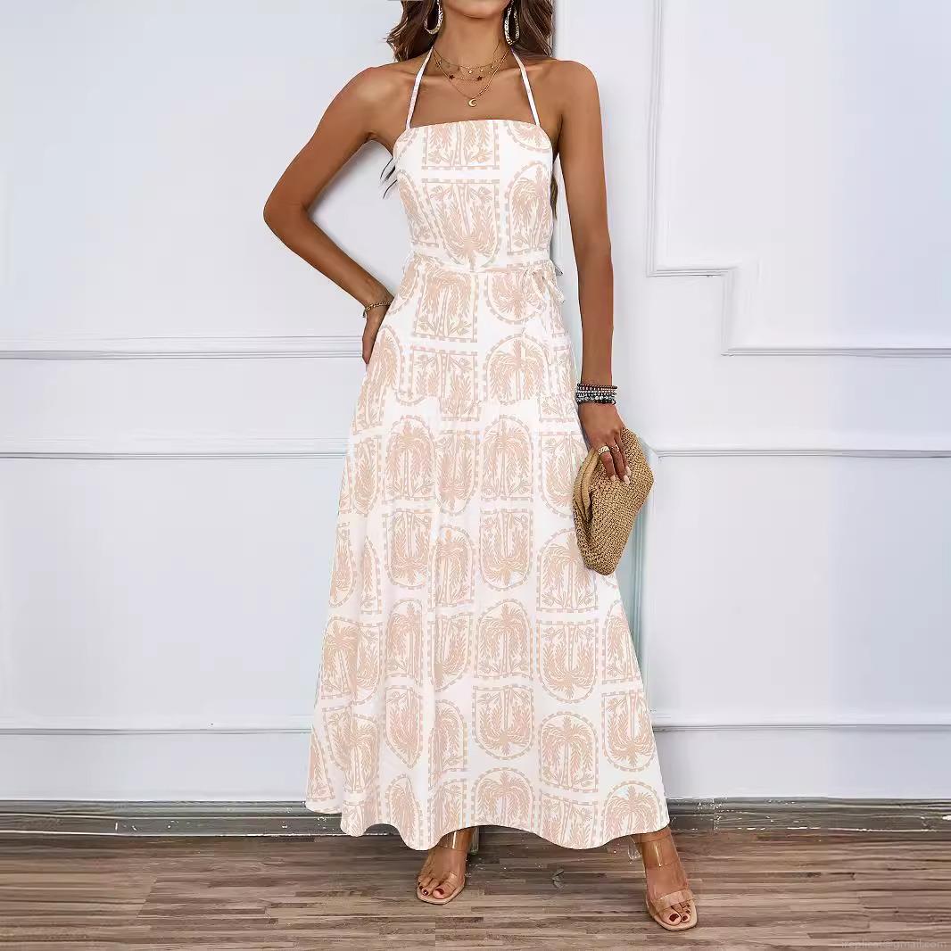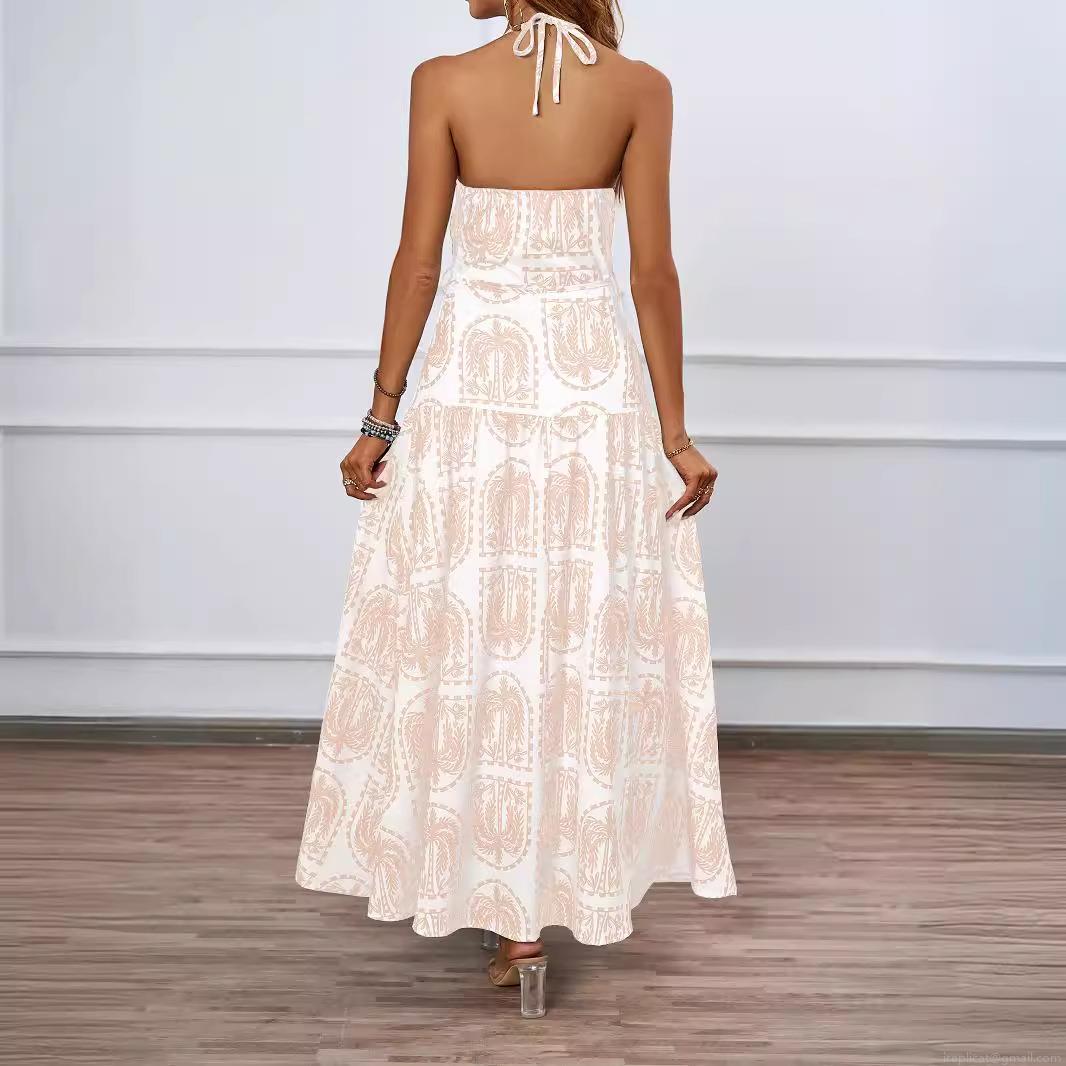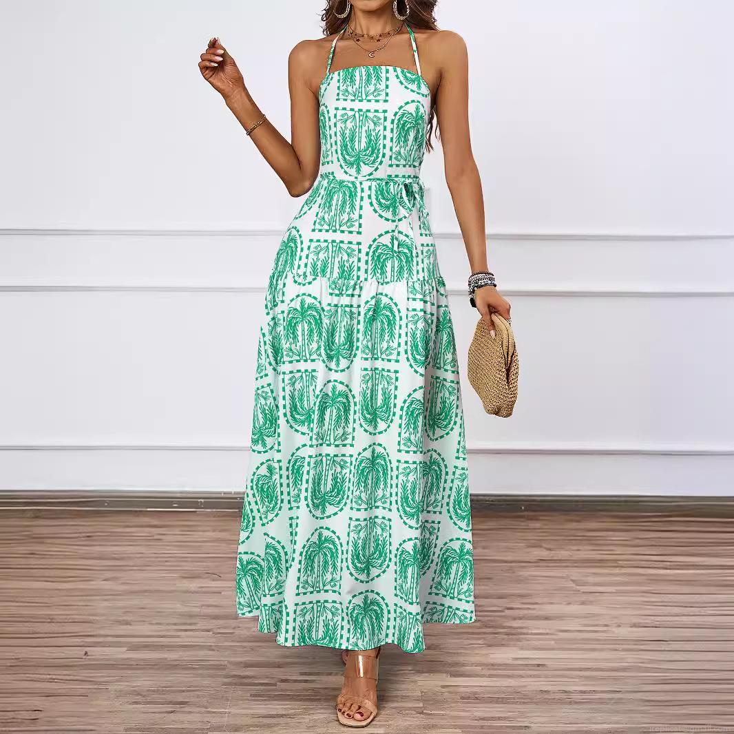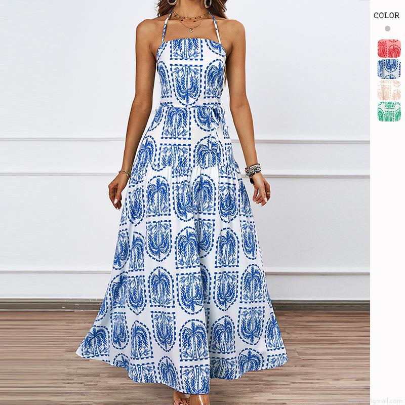• Women Vacation Halter Maxi Dress 100% Polyester Tropical Palm Tree Print Backless Tiered A-line Beach Sun Dress For Summer Holiday