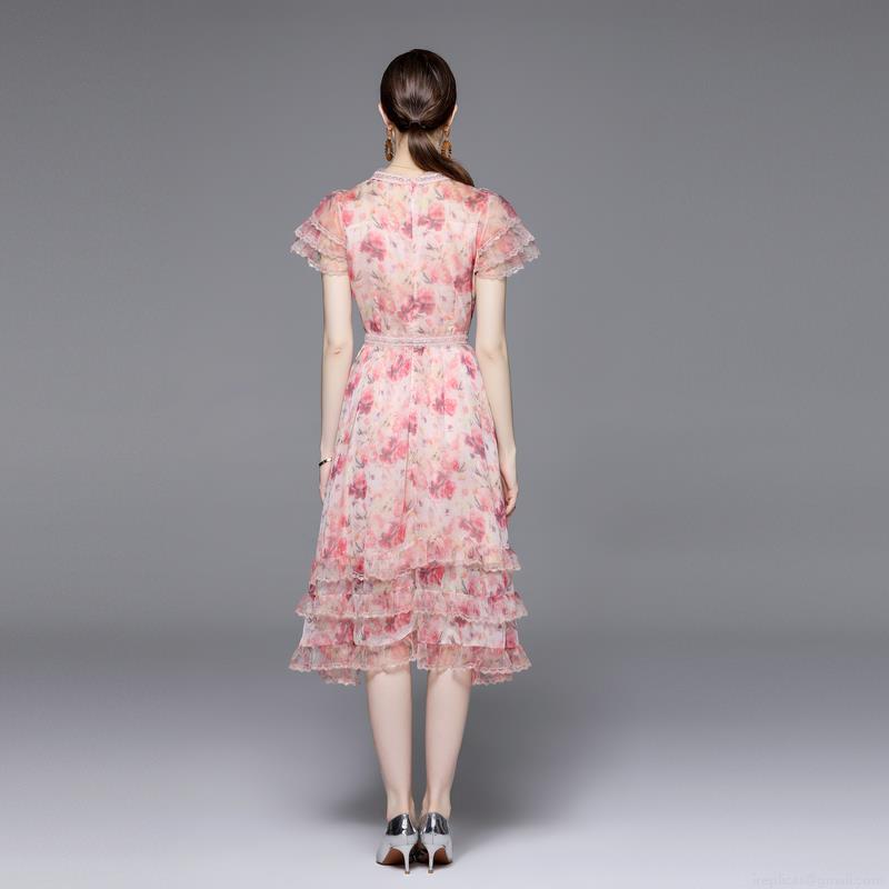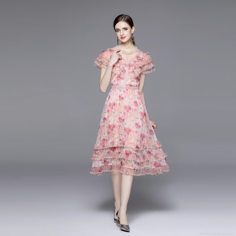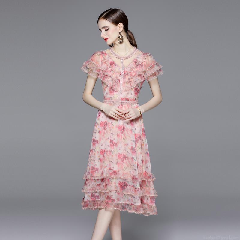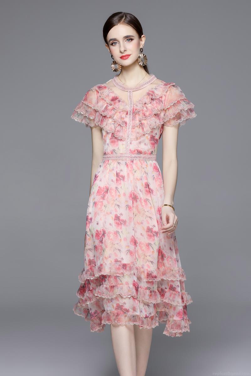 • Women Vintage Pink Floral Print Silk Chiffon Maxi Dress Ruffle Short Sleeve High Waist Lace Trim Elegant Summer Party Dress For Women