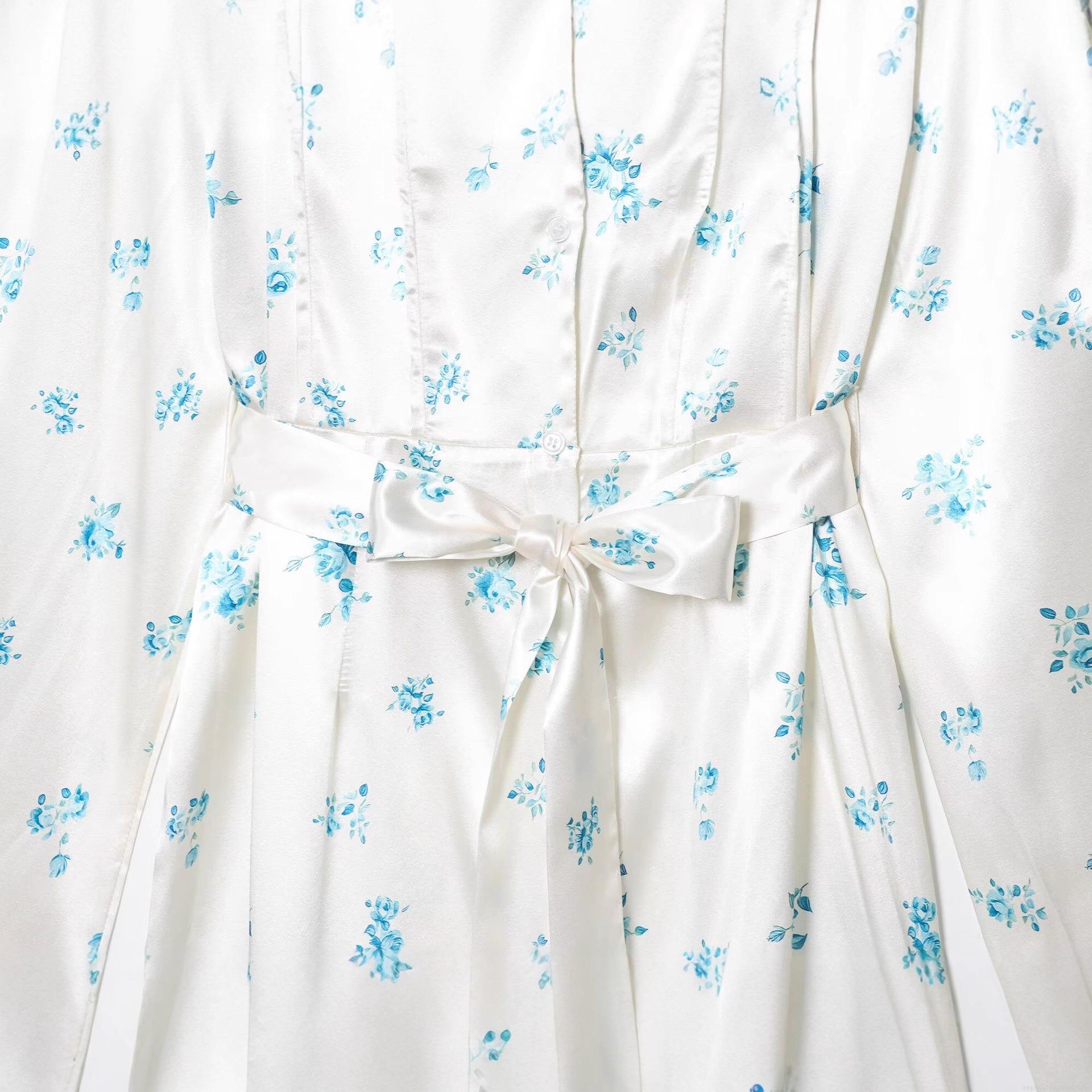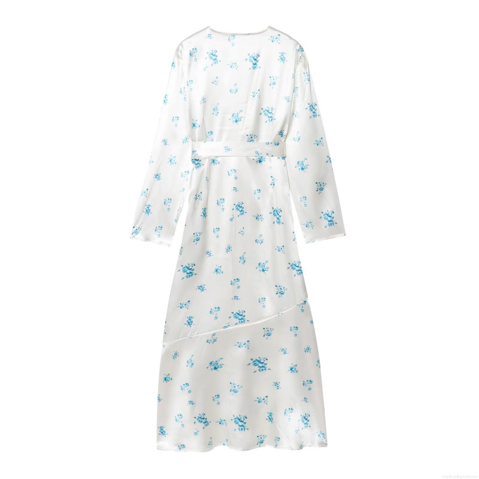 • Women Western V-Neck Waist Tie Satin Texture Maxi Dress Elegant Long Sleeve Blue Floral Print Split A-Line Party Dresses For Ladies