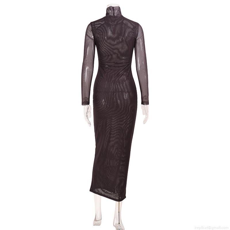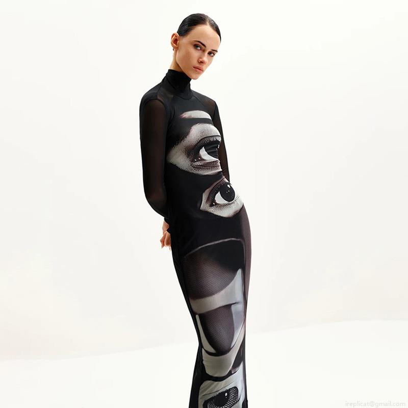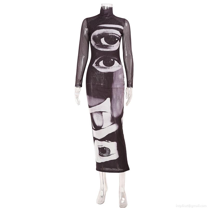 • Women's 3D Surrealist Eye Print Double Layer Mesh Dress High Neck Long Sleeve Slim Fit Bodycon Maxi Dress Avant-Garde Y2K Streetwear