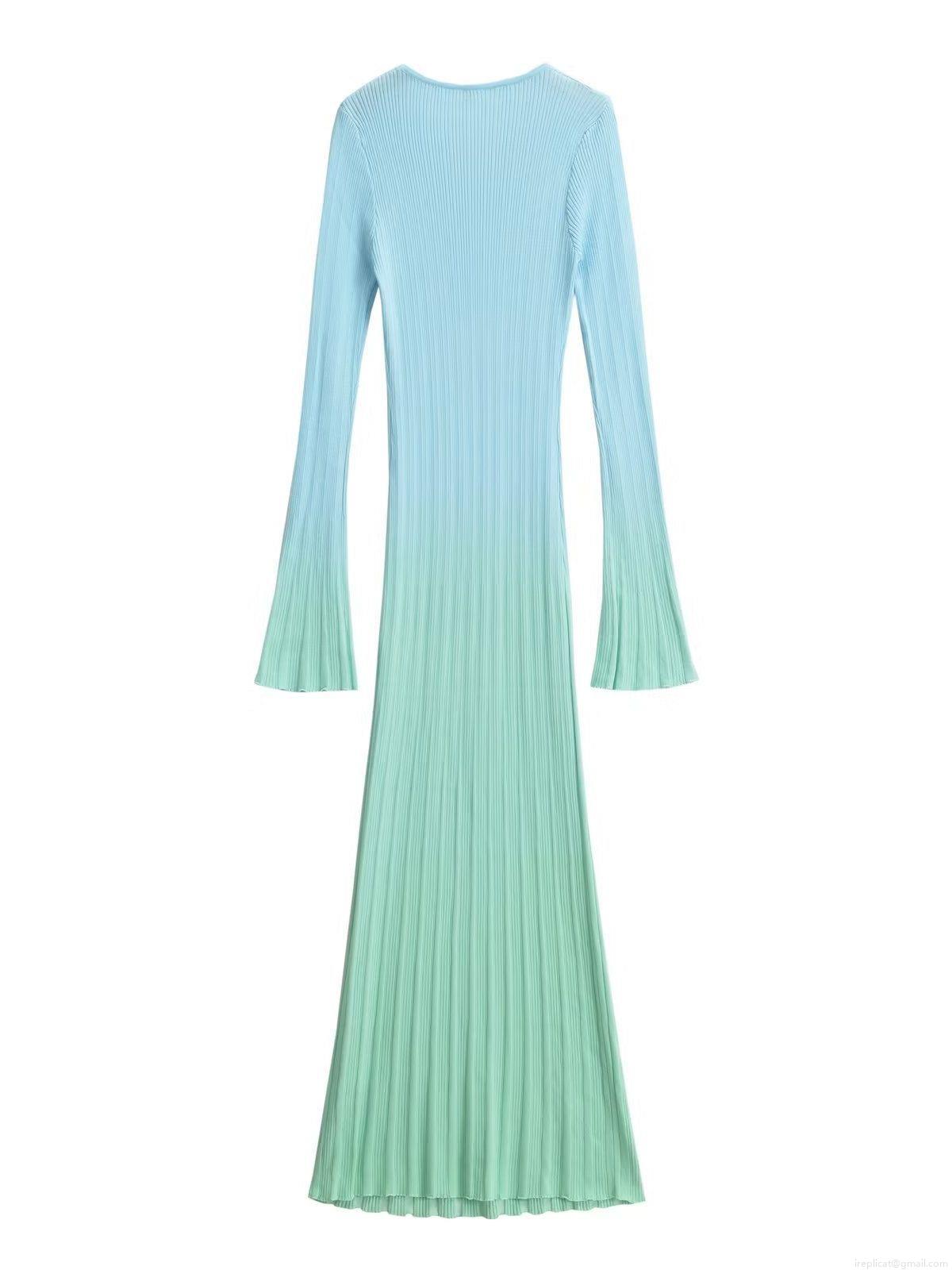 Women's Autumn Gradient Blue Green Long Sleeve Ribbed Knit Maxi Dress Slim Fit Round Neck Bell Sleeve Bodycon Pullover Dress