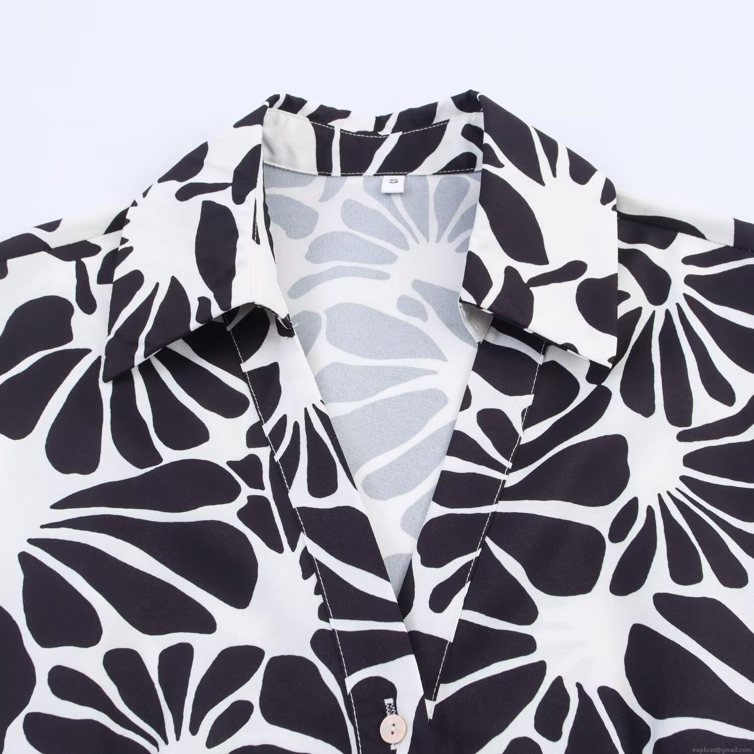 • Women's Black and White Floral Print Poplin Maxi Shirt Dress Short Sleeve Button Down Elegant Long Dress With Belt For Daily Vacation Ladies