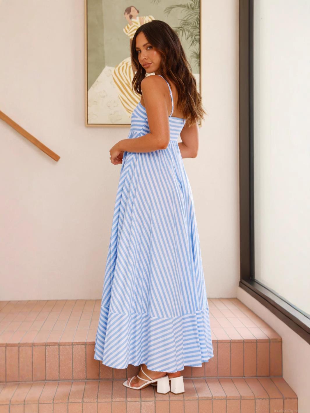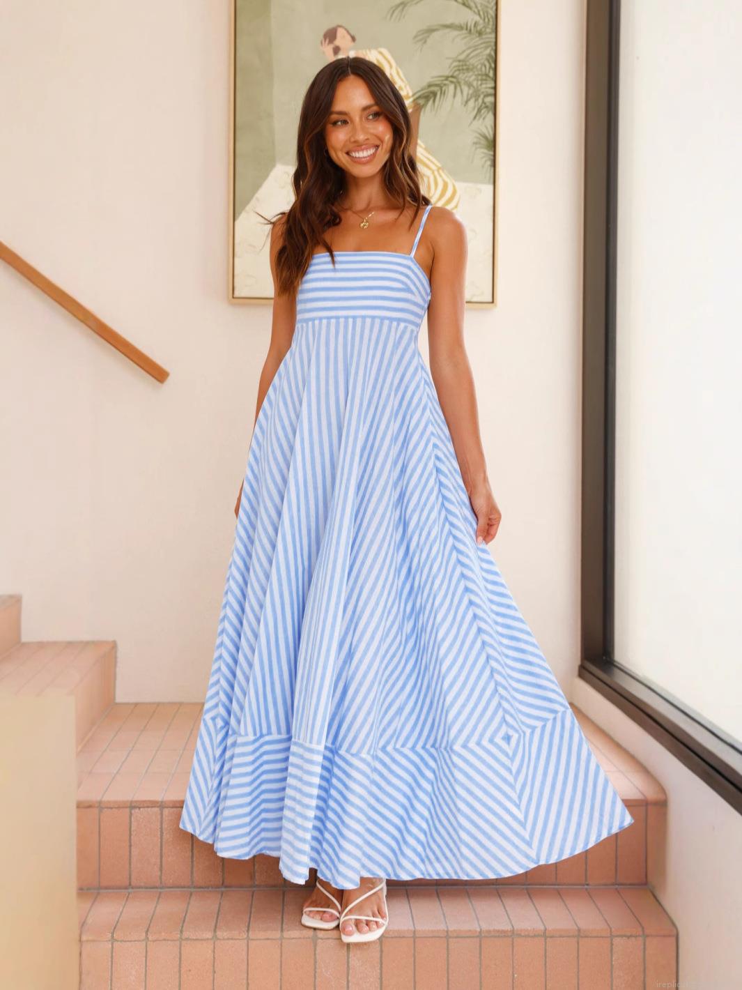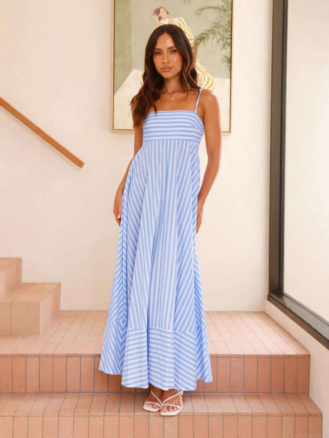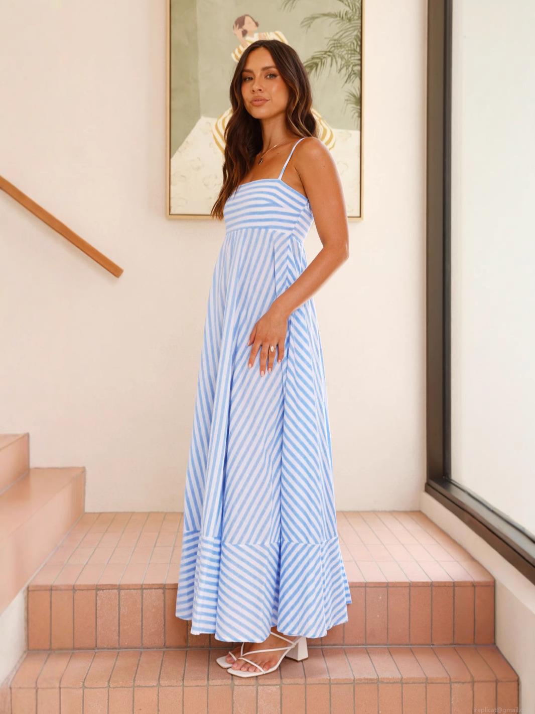 • Women's Blue and White Striped Strappy Maxi Dress Sexy Backless Large Swing A-Line Sundress For Summer Vacation Beach Party