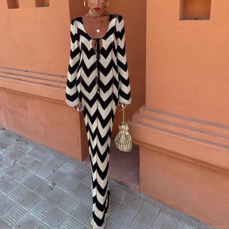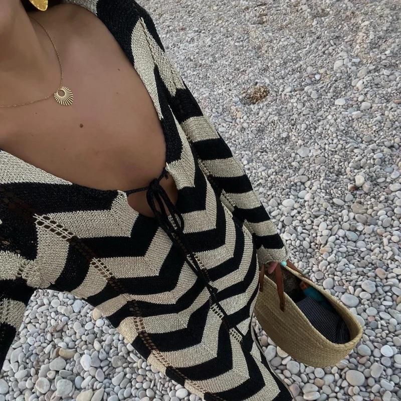 • Women's Bohemian Black and White Chevron Knit Maxi Dress Deep V Neck Tie Up Long Flare Sleeve Crochet Beach Resort Vacation Sexy Long Dress