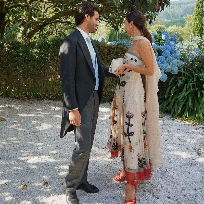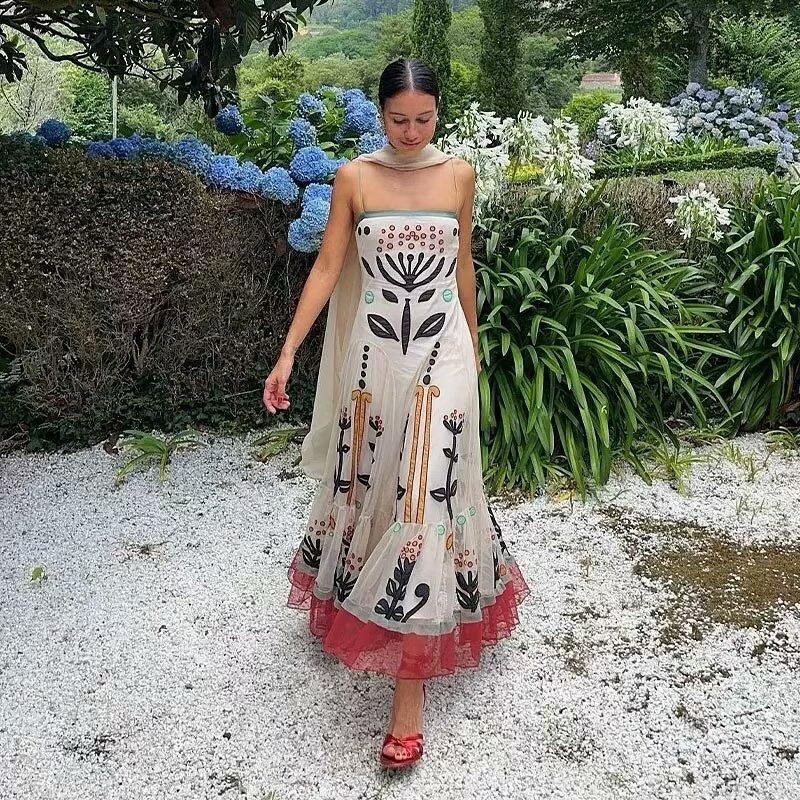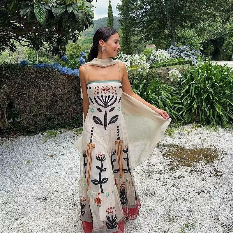 Women's Bohemian Ethnic Embroidery Sling Maxi Dress Summer Vacation Mesh Patchwork Beach Long Dress With Shawl Elegant Beige Floral Printed Vestidos