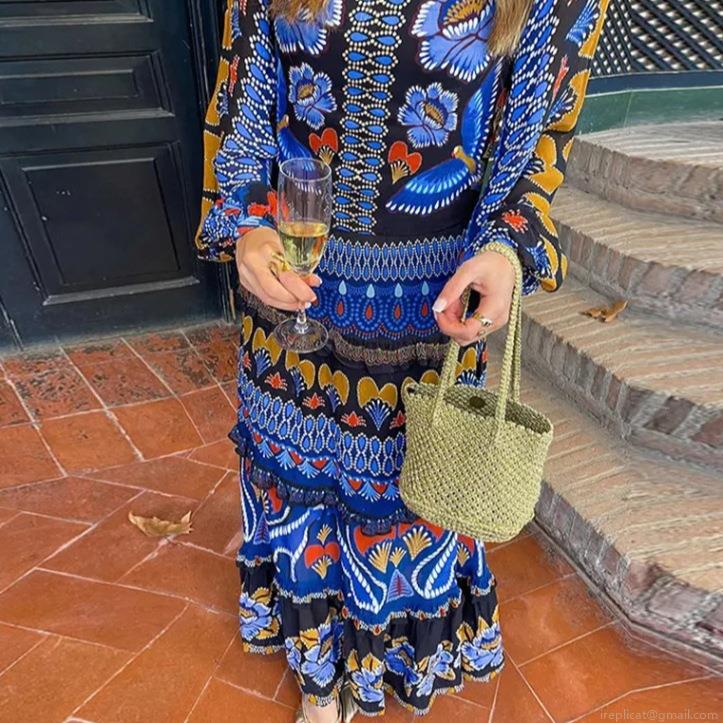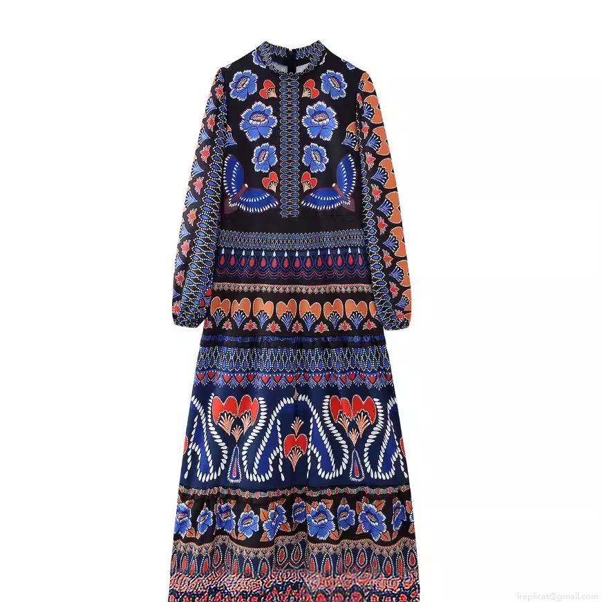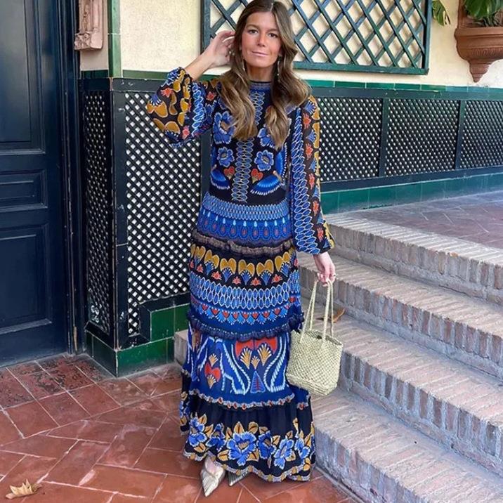 • Women's Bohemian Floral Print Maxi Dress 100% Polyester Stand Collar Long Lantern Sleeve Backless Tiered Long Vacation Beach Ethnic Style Dress