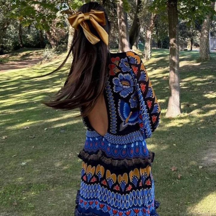 Butterfly, 3D Print, Birds, Geometric Patterns, Heart-shaped, Lantern Sleeves, Backless Design, Ethnic Floral, Multi-layered Patchwork Skirt