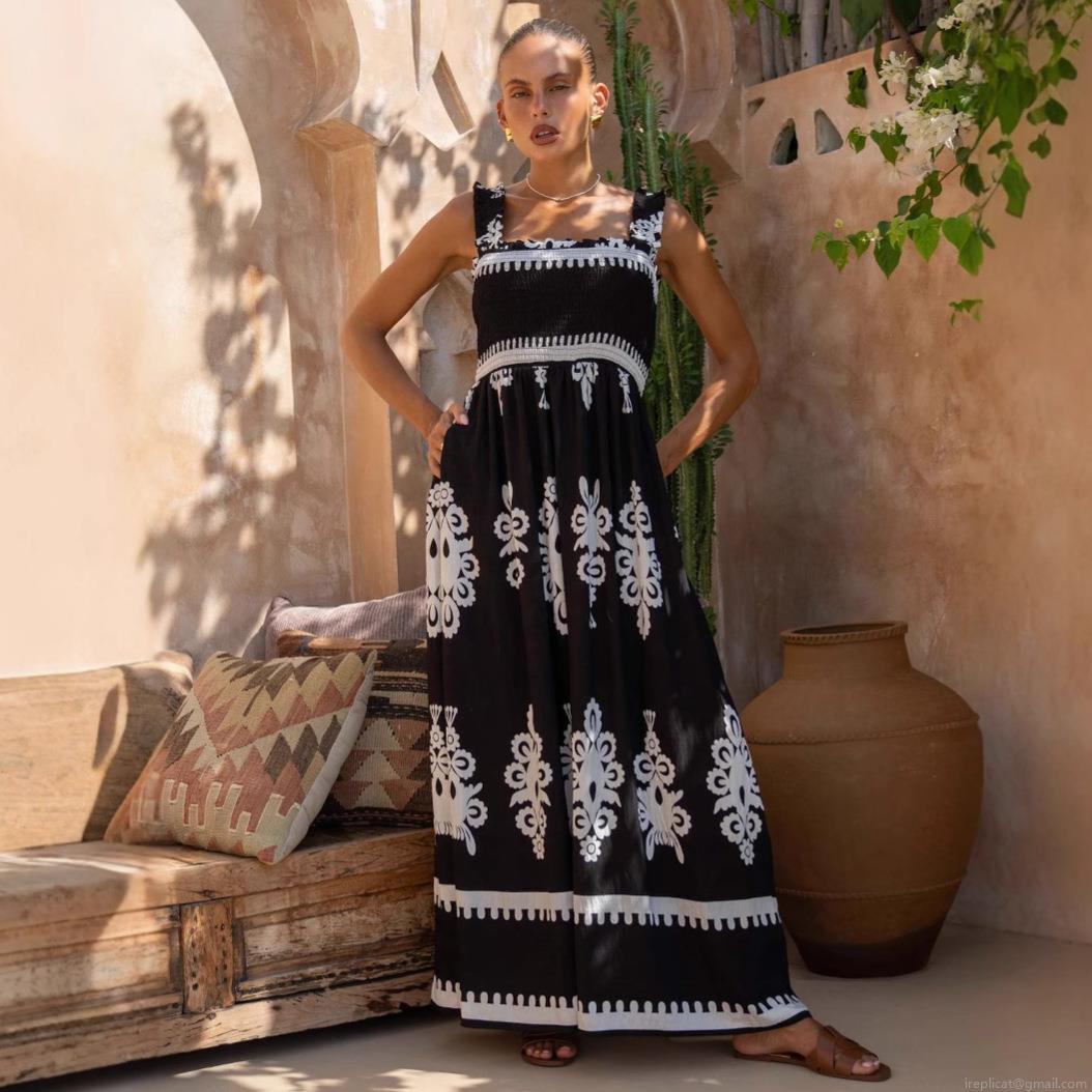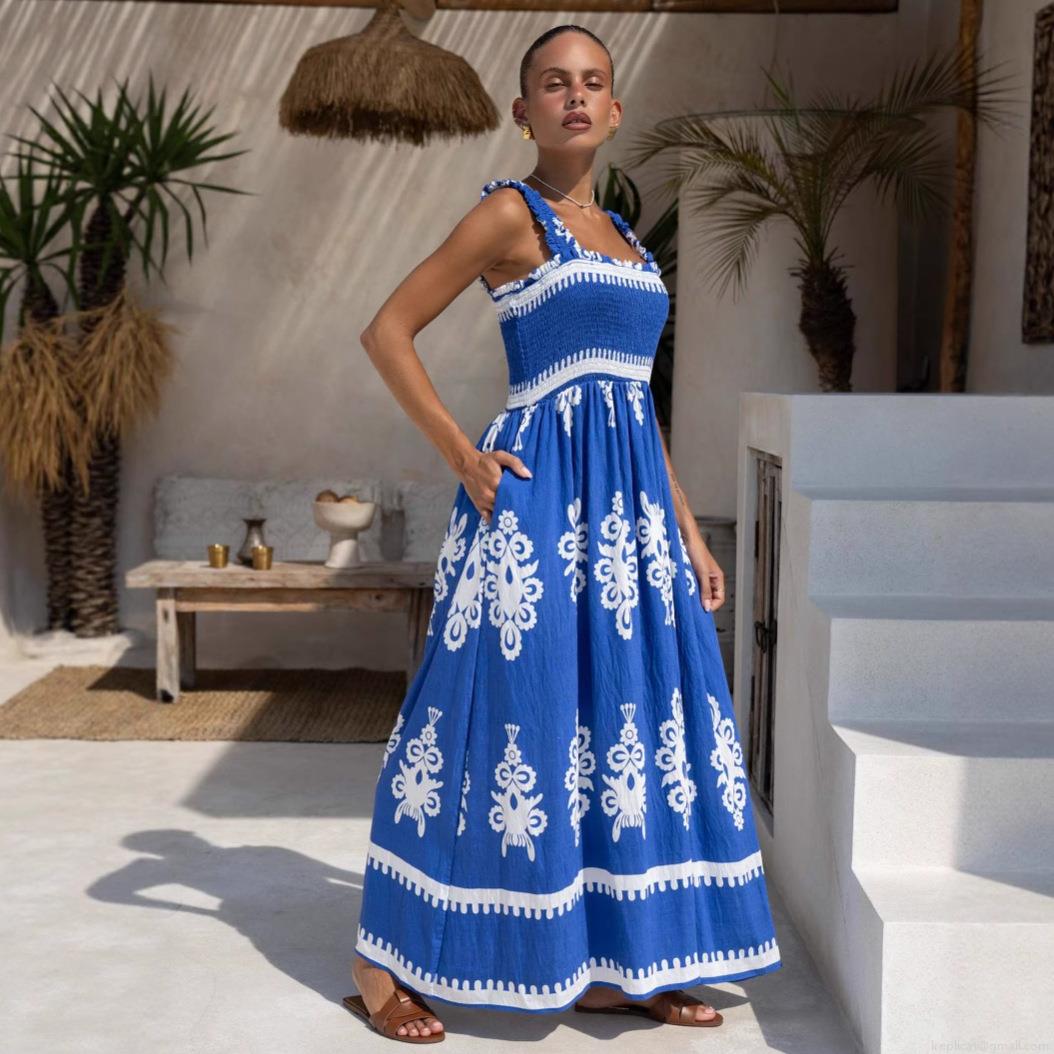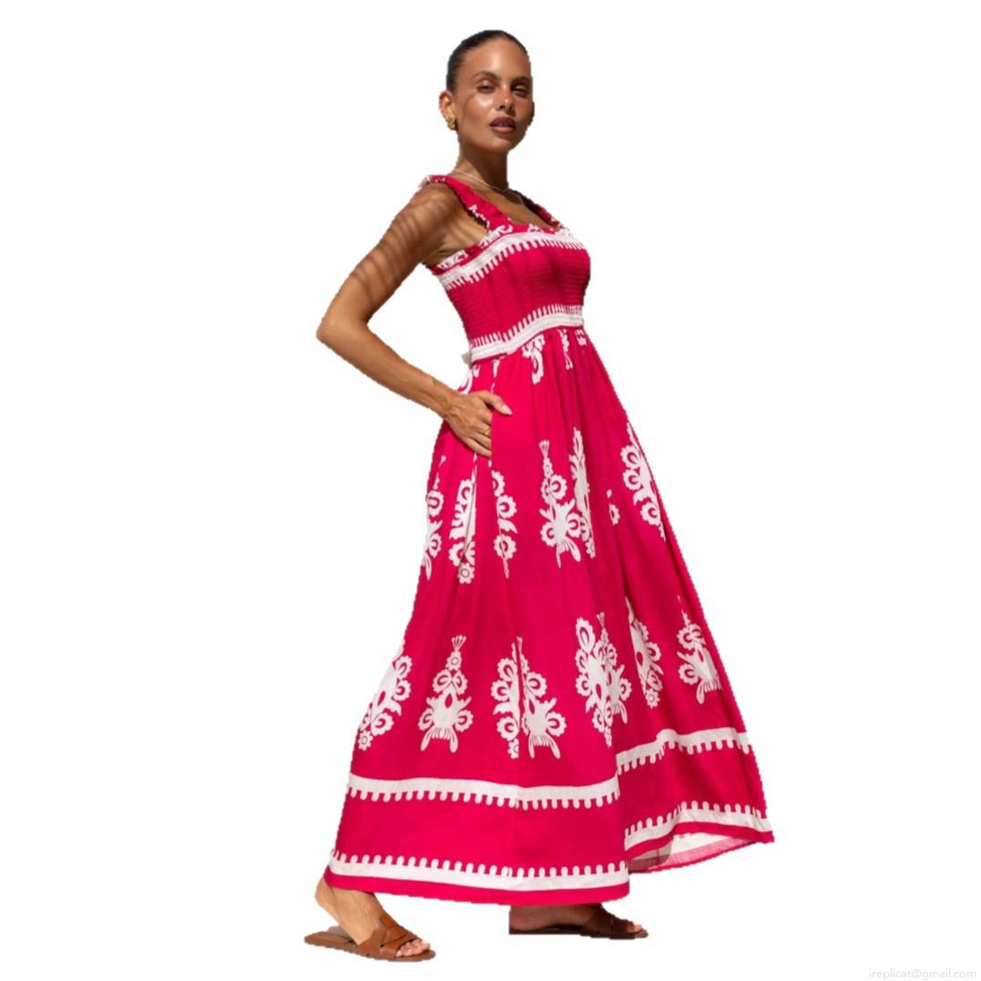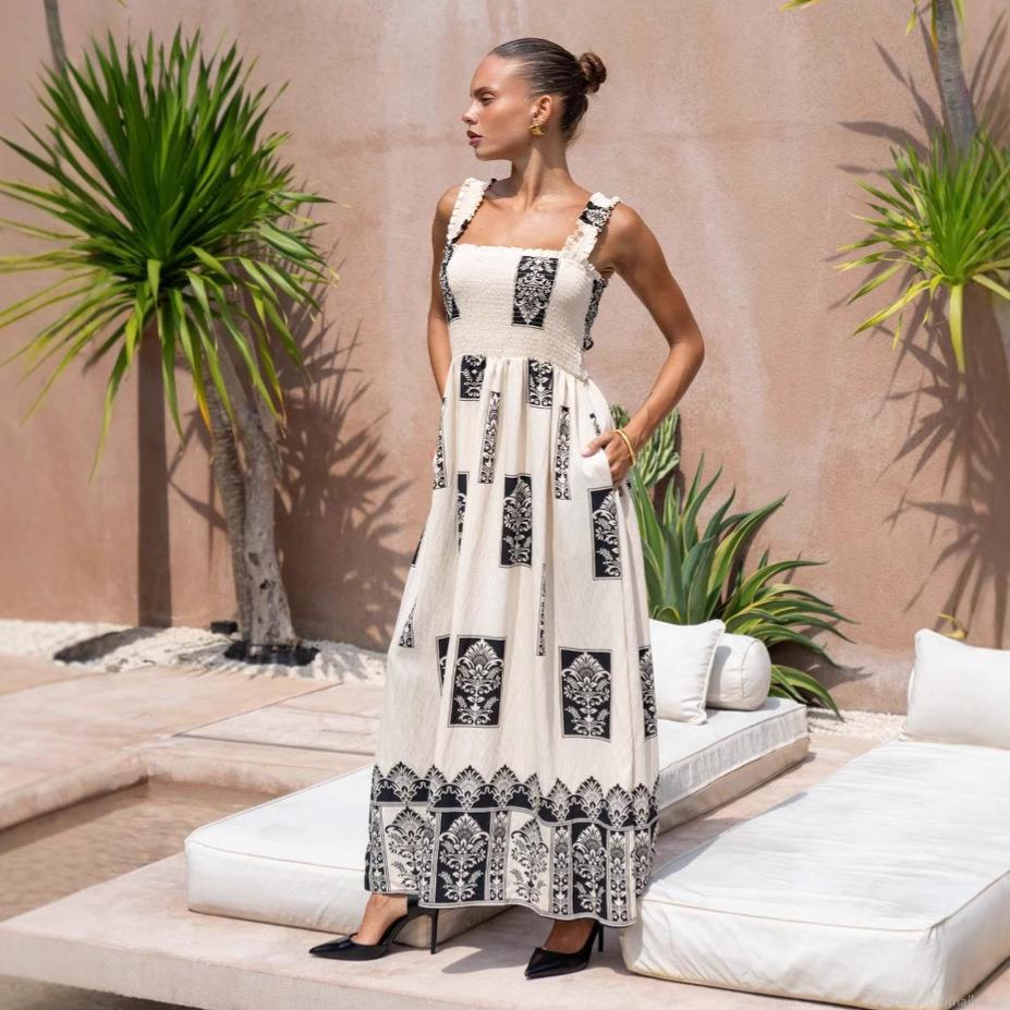 • Women's Bohemian Floral Print Maxi Dress 95% Polyester Smocked Bodice Spaghetti Strap Summer Beach Vacation Ruffle Long Dress