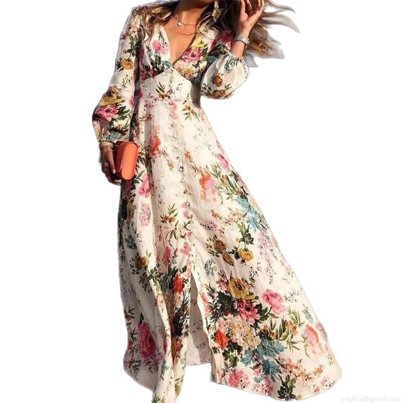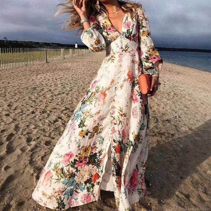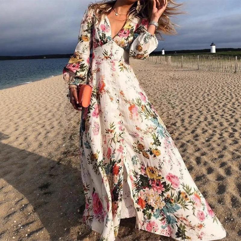 • Women's Bohemian Floral Print V-Neck Long Sleeve Maxi Dress With Button Front Vacation Beach Party Casual Elegant Long Dress