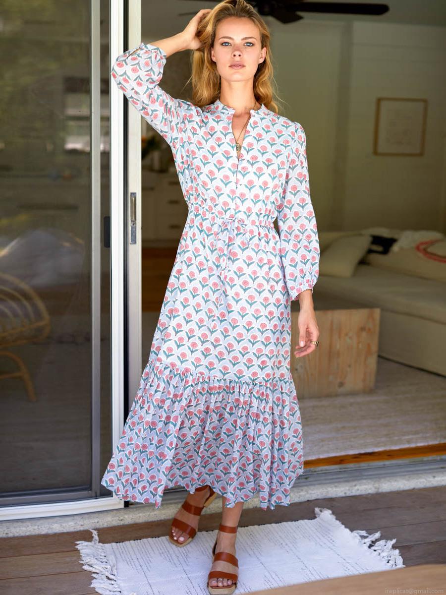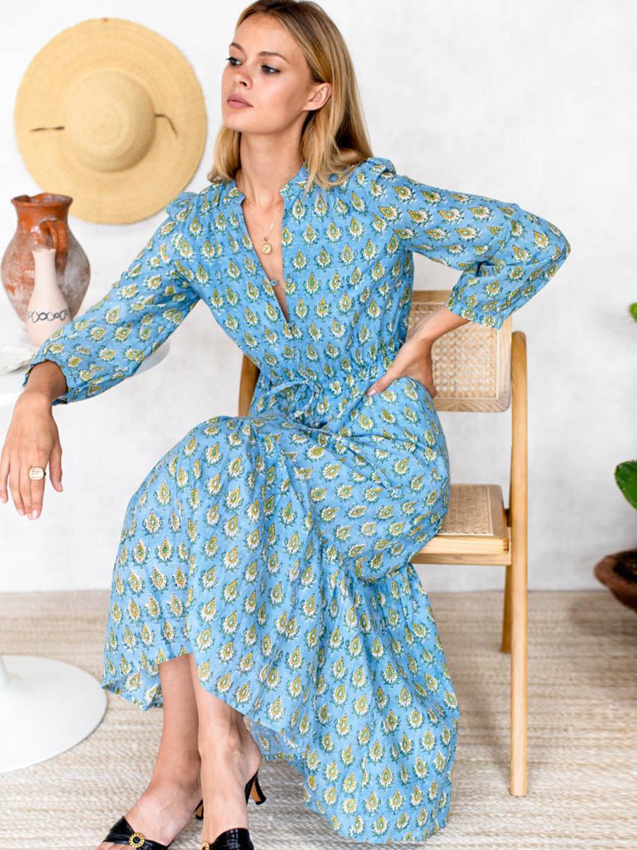 • Women's Bohemian Floral Print V-Neck Maxi Dress Elegant Long Sleeve High Waist Drawstring Ruffle A-Line Long Dress For Vacation Beach Party