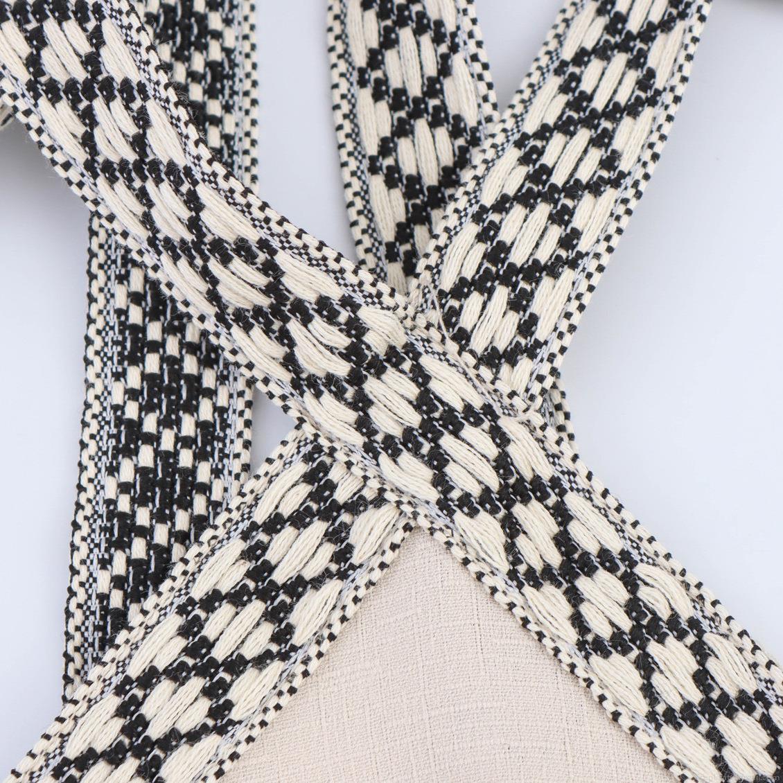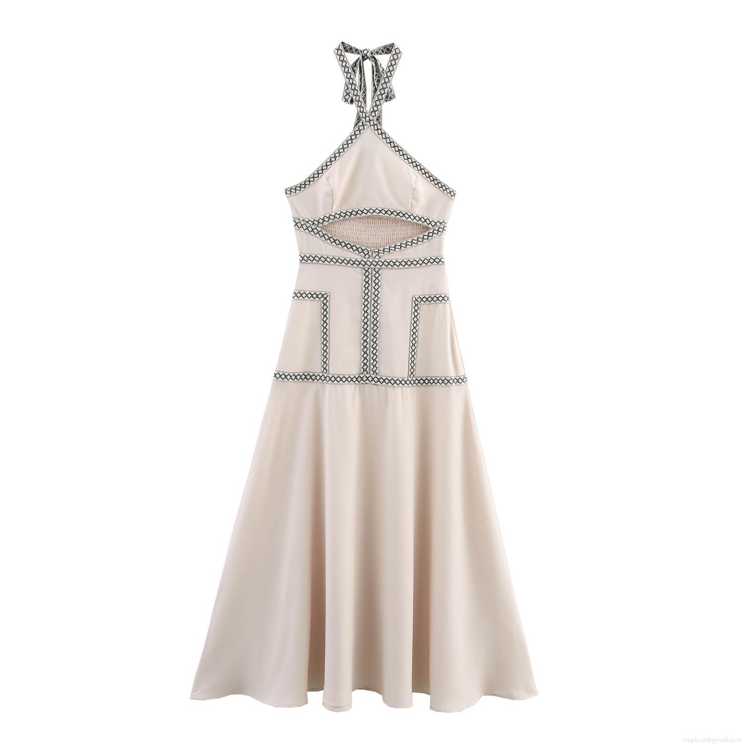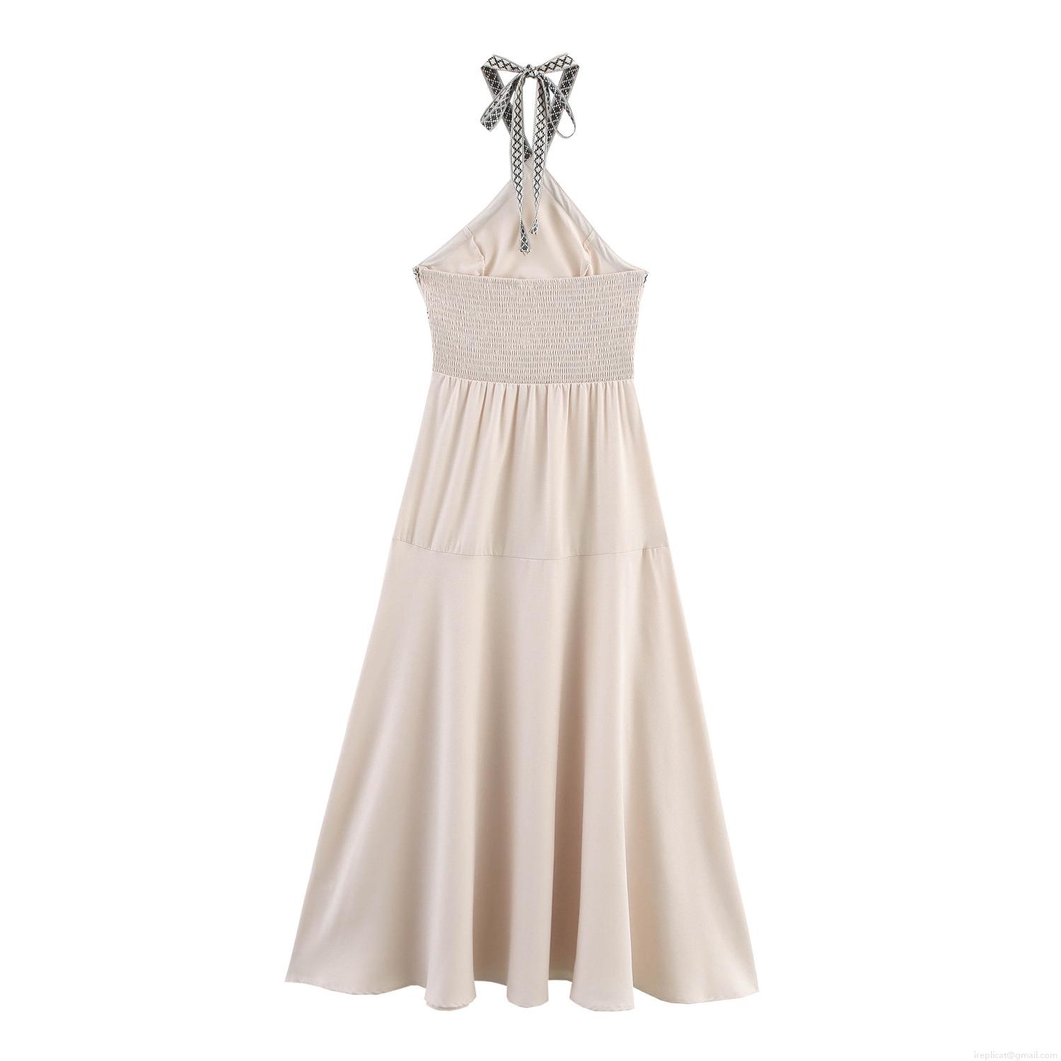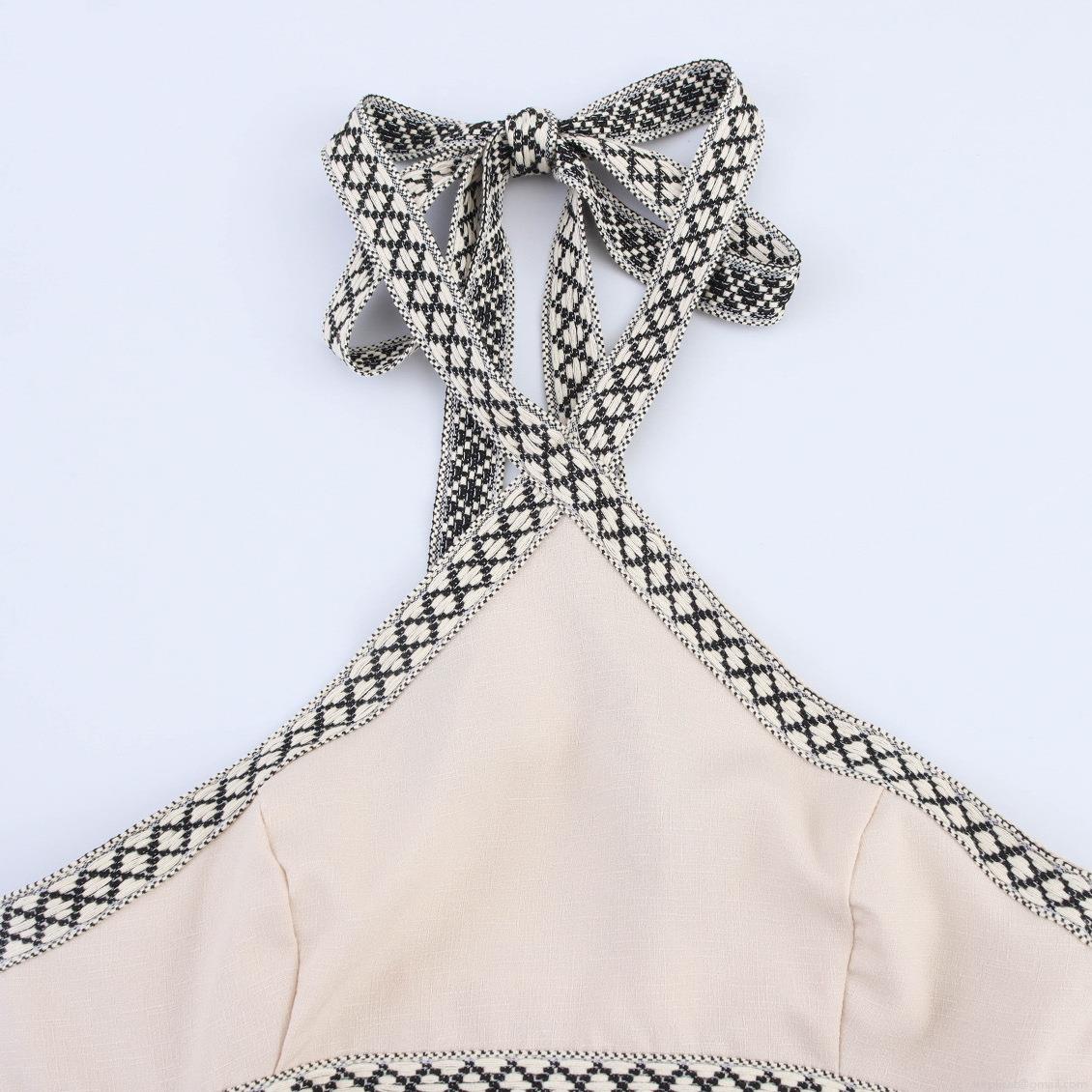 • Women's Bohemian Halter Maxi Dress Backless Smocked Waist Solid Color Beach Vacation Long A-Line Dress with Geometric Ribbon Trim Sleeveless Vestidos