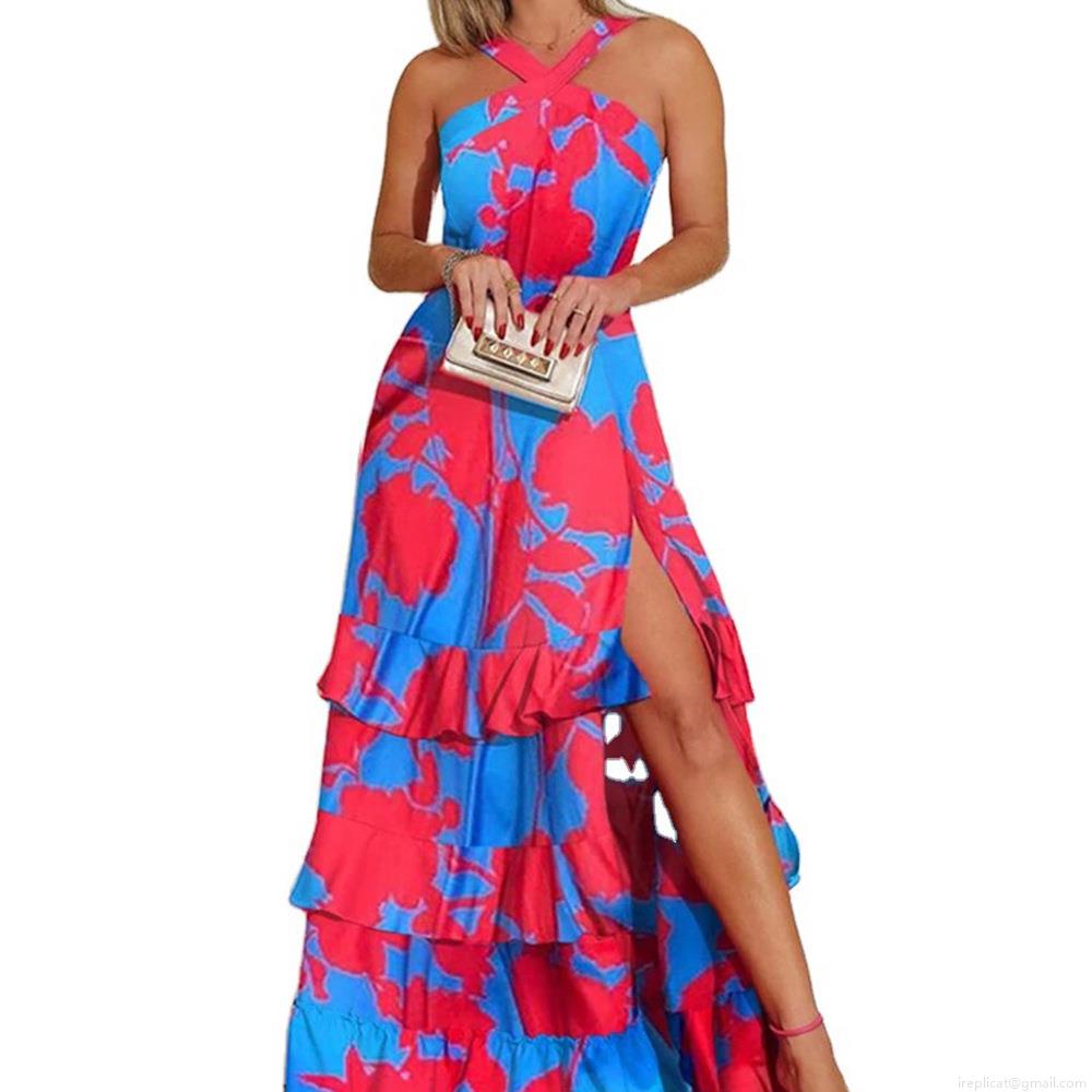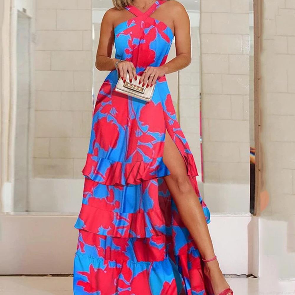 • Women's Bohemian Halter Maxi Dress Polyester Floral Print Sleeveless Backless High Slit Ruffle Cake Skirt For Beach Party Vacation Elegant Summer Dress