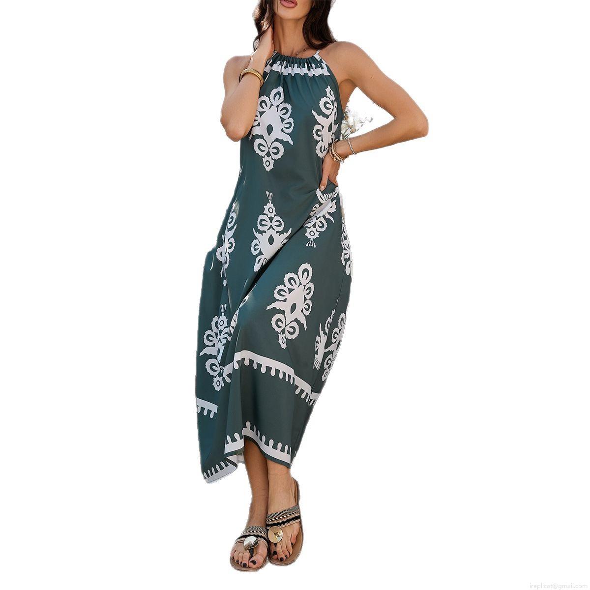 • Women's Bohemian Halter Maxi Dress Sleeveless Contrast Print Backless Tie Back A-Line Long Dress For Summer Beach Vacation Resort 100% Polyester Elegant Ladies Sundress