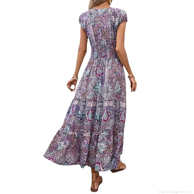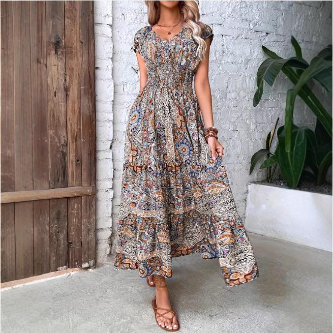 • Women's Bohemian Paisley Floral Print Maxi Dress Polyester Spandex V Neck Puff Short Sleeve Smocked High Waist Flowy Long Dress for Summer Vacation