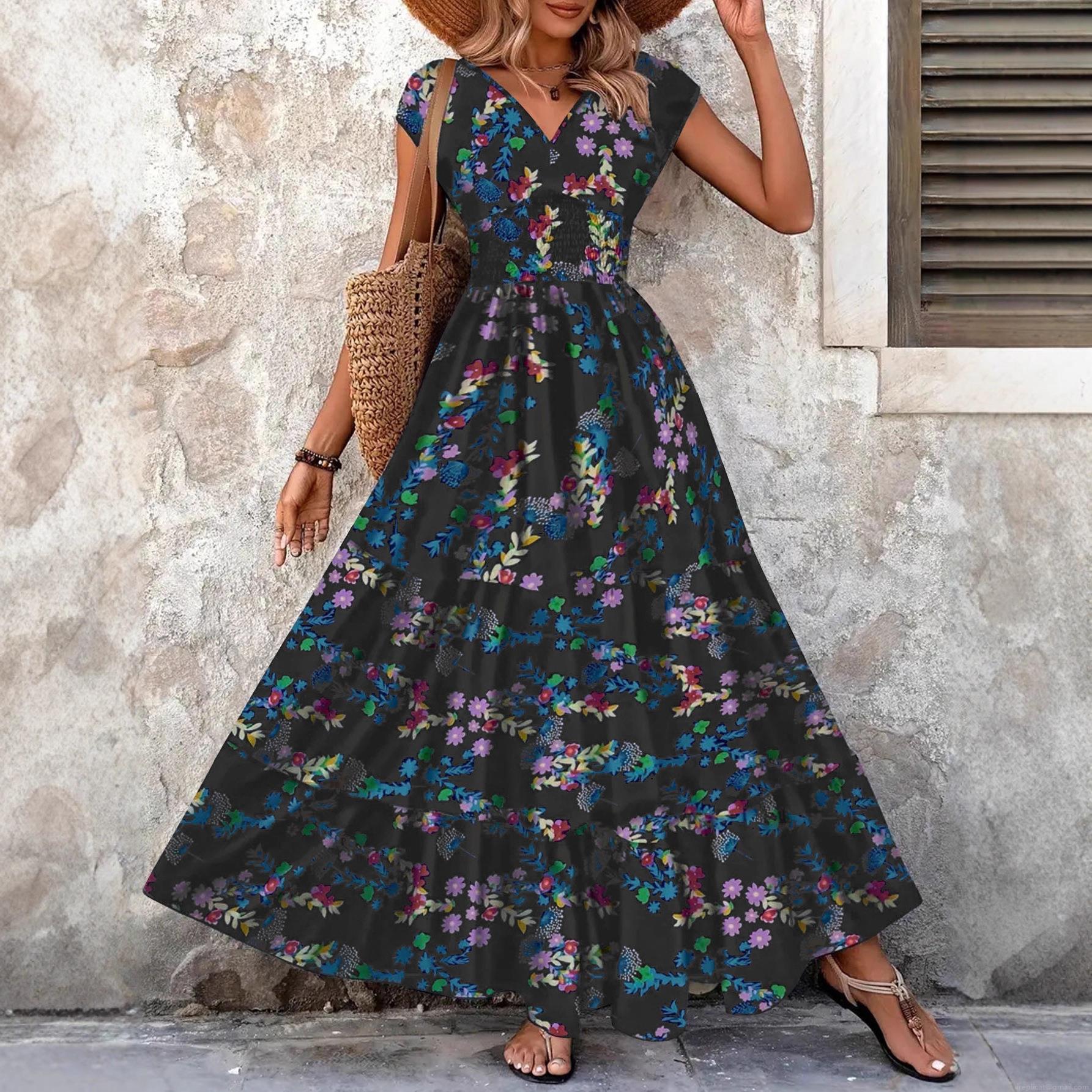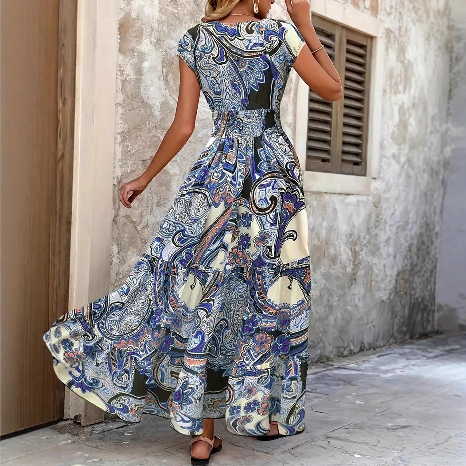 • Women's Bohemian Paisley Print Maxi Dress Elegant Deep V-Neck Short Sleeve Summer Vacation High Waist A-Line Side Slit Long Dress