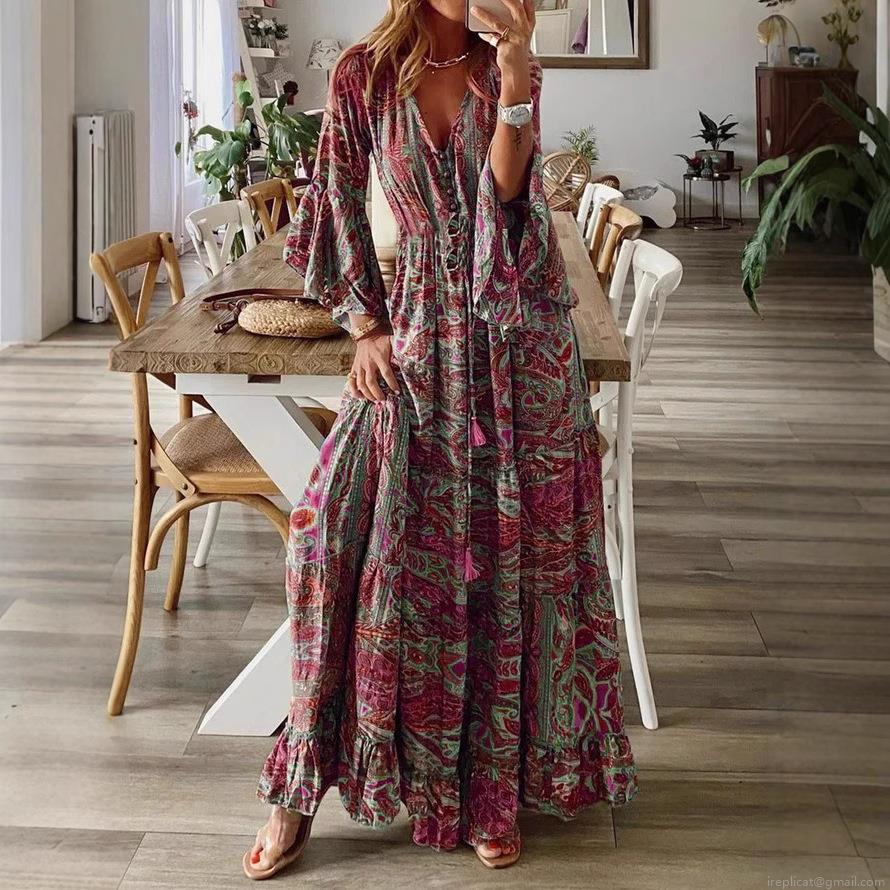 • Women's Bohemian Paisley Print Maxi Dress Vintage V Neck Flare Sleeve High Waist Flowy Beach Vacation Long Dress Polyester Spandex