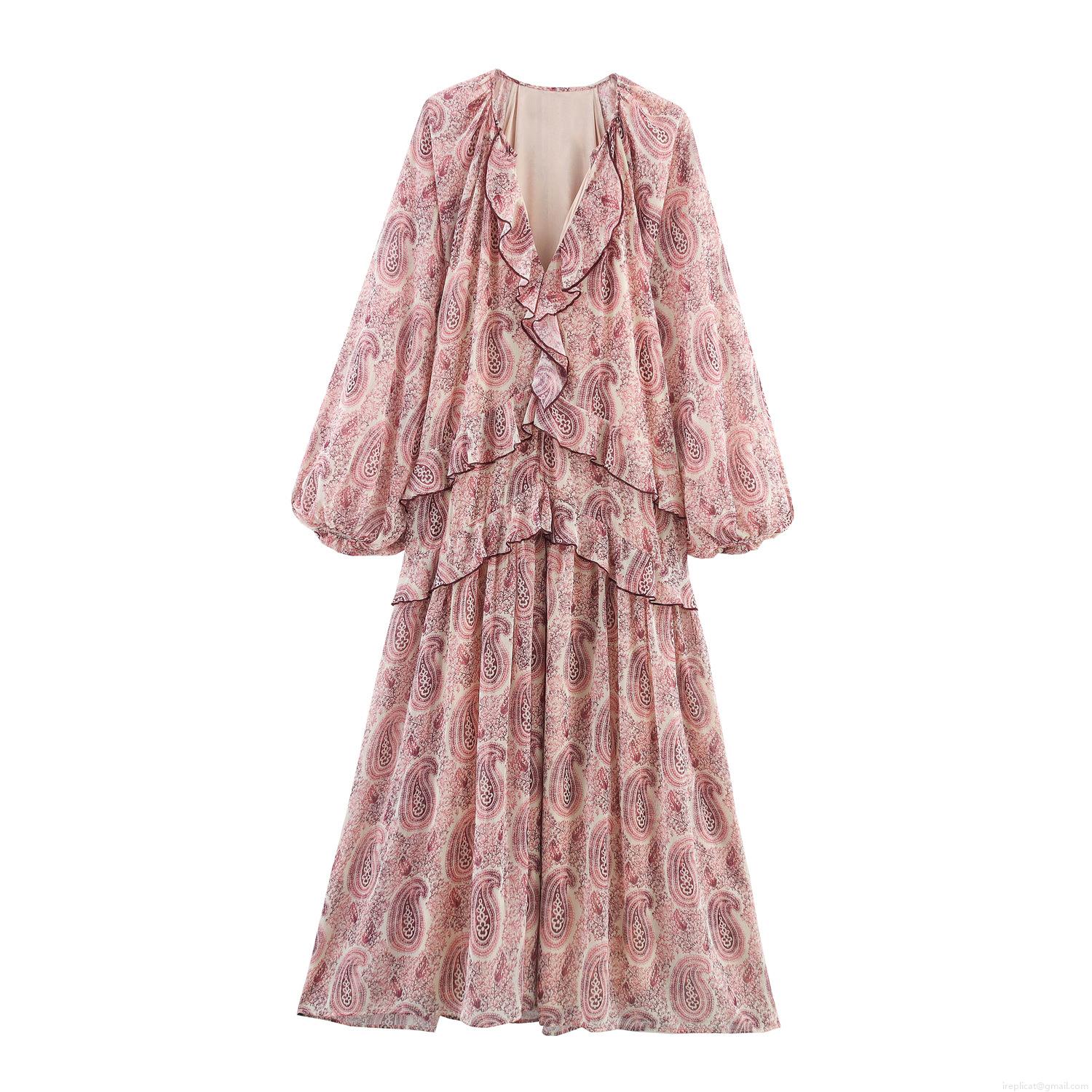 • Women's Bohemian Paisley Print Tiered Ruffle Maxi Dress V Neck Long Lantern Sleeve Elegant Pink Flowy Long Dress for Party Vacation
