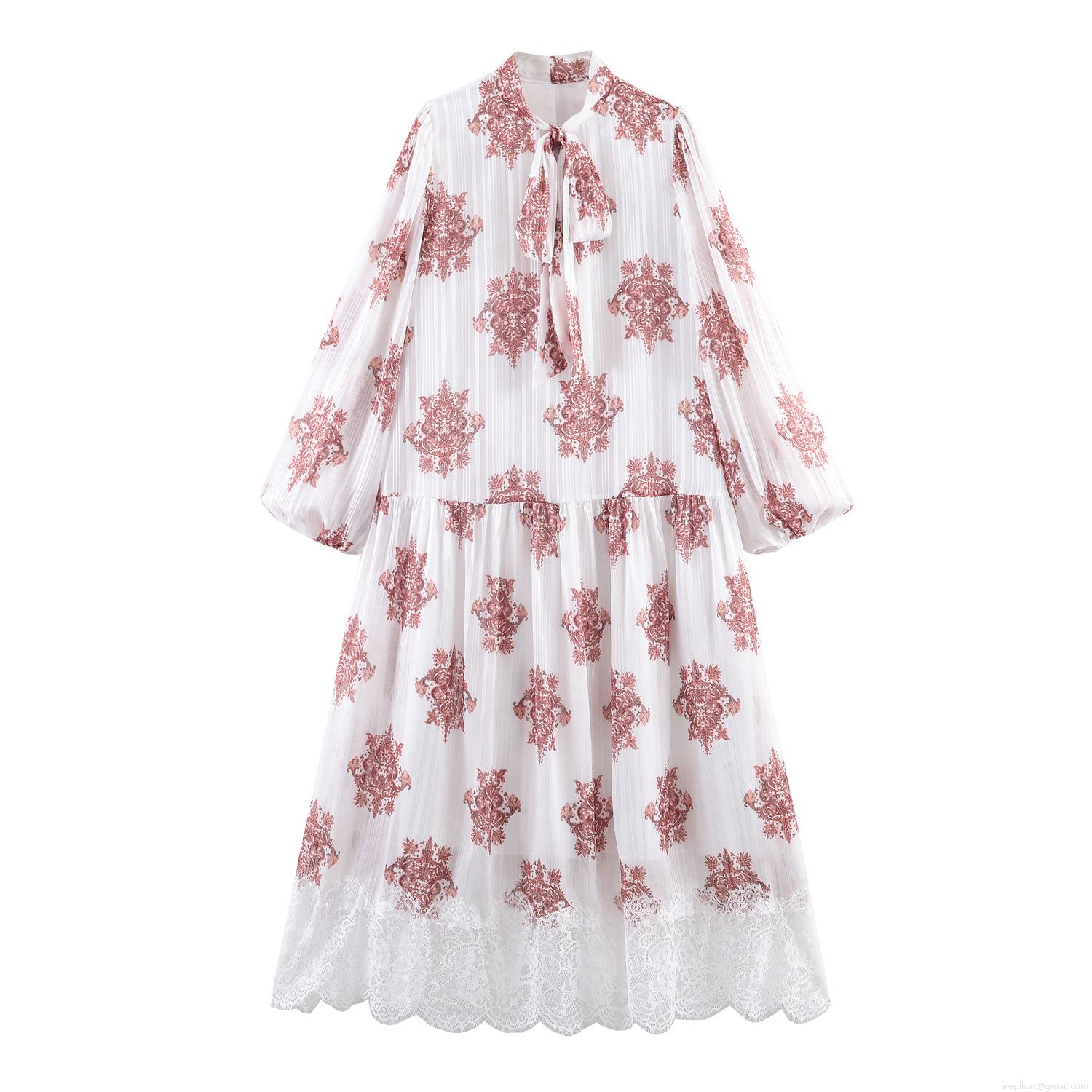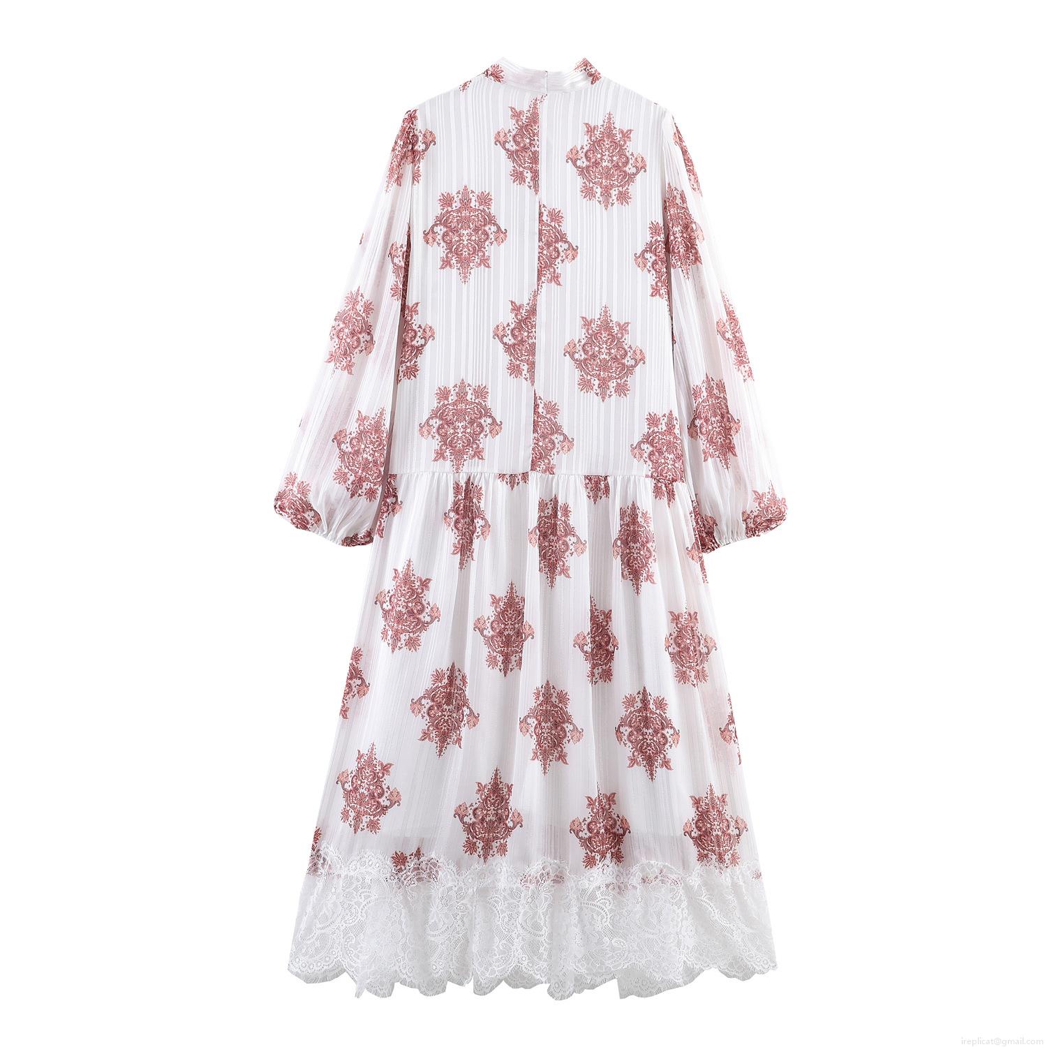 Women's Bohemian Print Maxi Dress Elegant Paisley Lantern Sleeve Pleated Lace Patchwork Long Dress Casual Vocation Party Wear