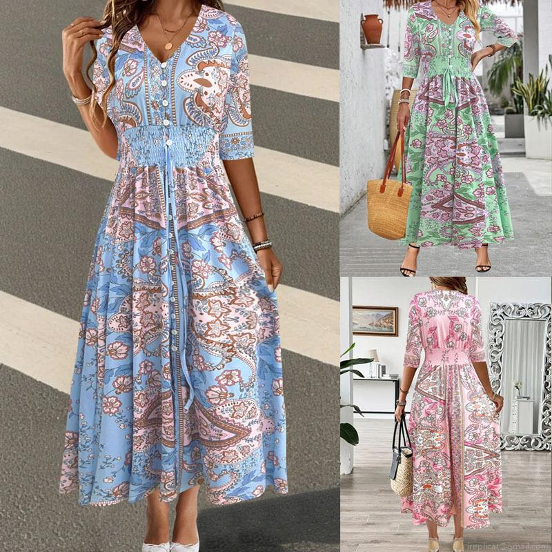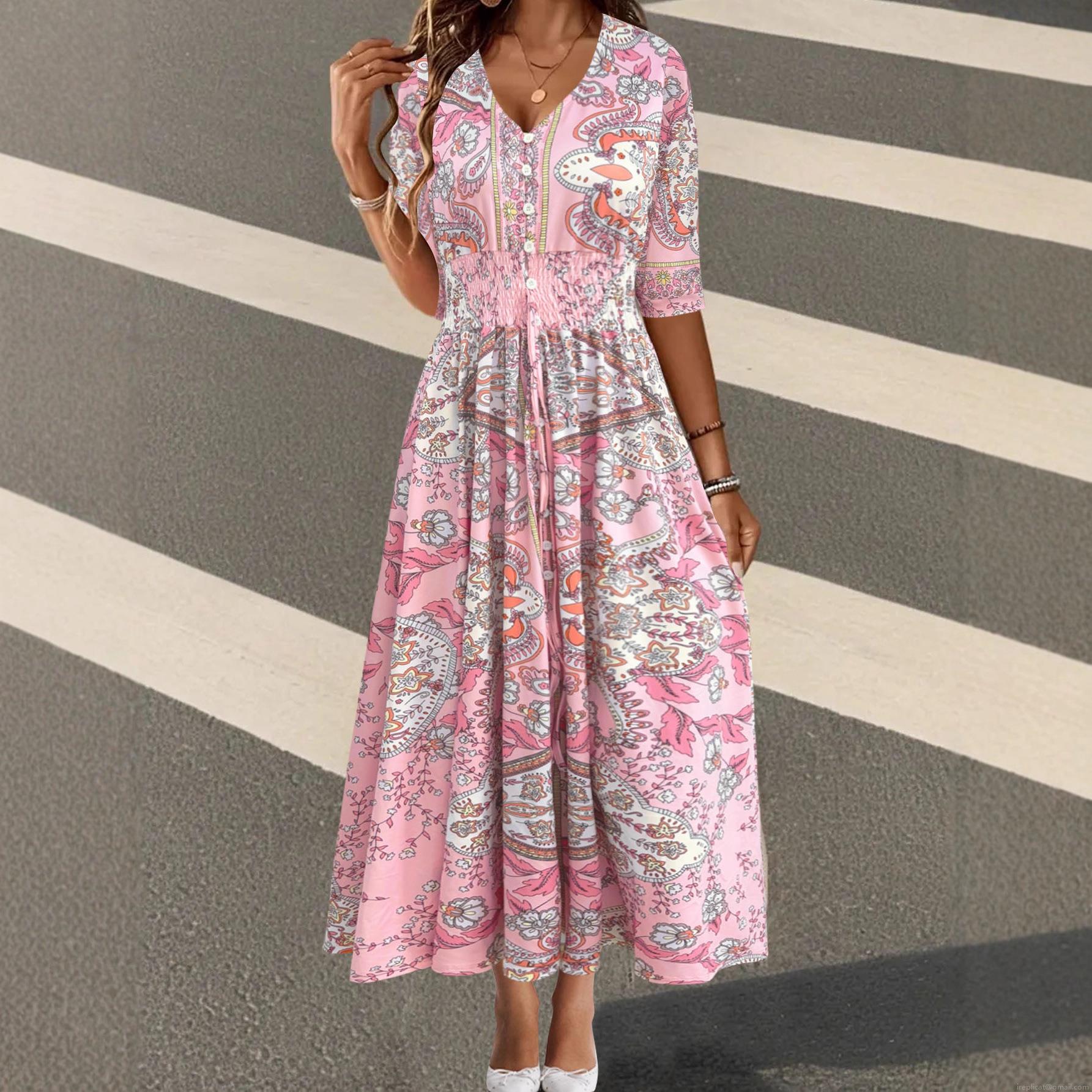 • Women's Bohemian Print Maxi Dress V-Neck Mid Sleeve A-Line Flowy Vacation Long Dress Plus Size Polyester Spandex Blend Milk Silk Casual Elegant Floral Paisley Pattern Dress
