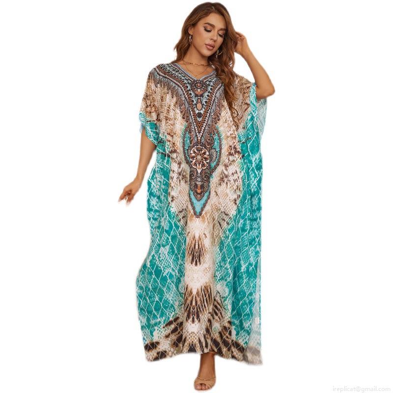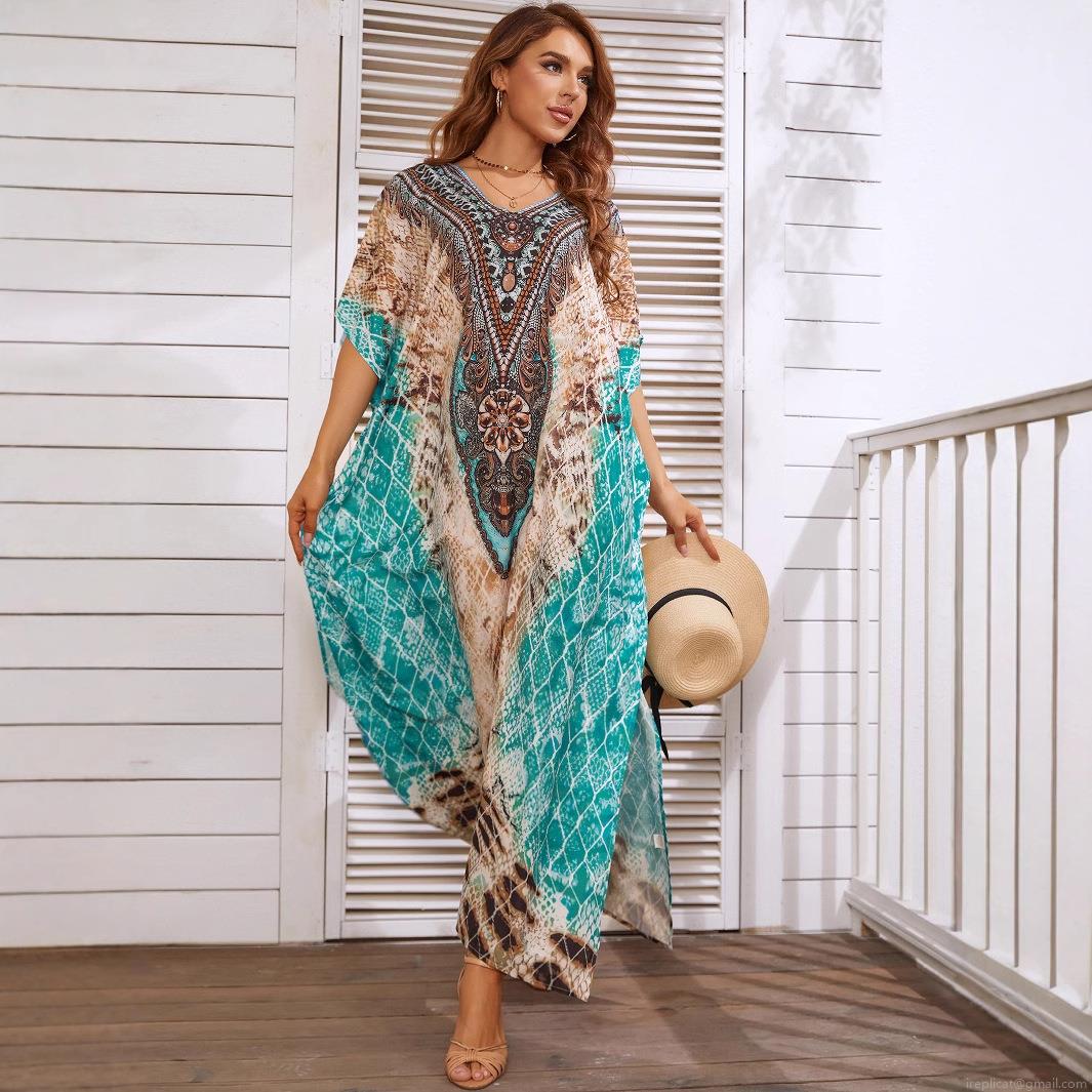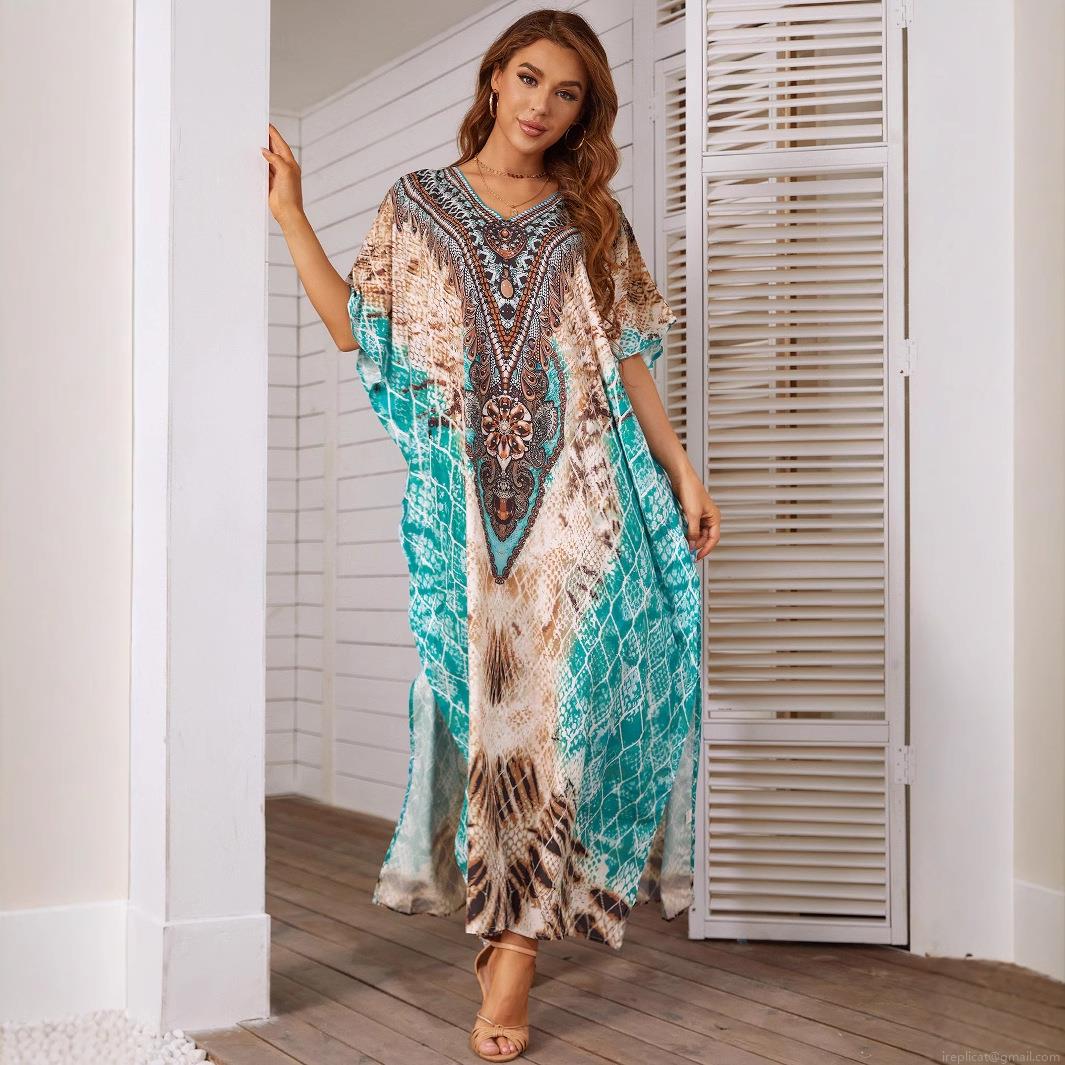 • Women's Bohemian Printed Kaftan Maxi Dress V-Neck Loose Beach Cover-Up Quick-Dry Polyester Vacation Robe Oversized Ethnic Style Summer Sunscreen Shirt