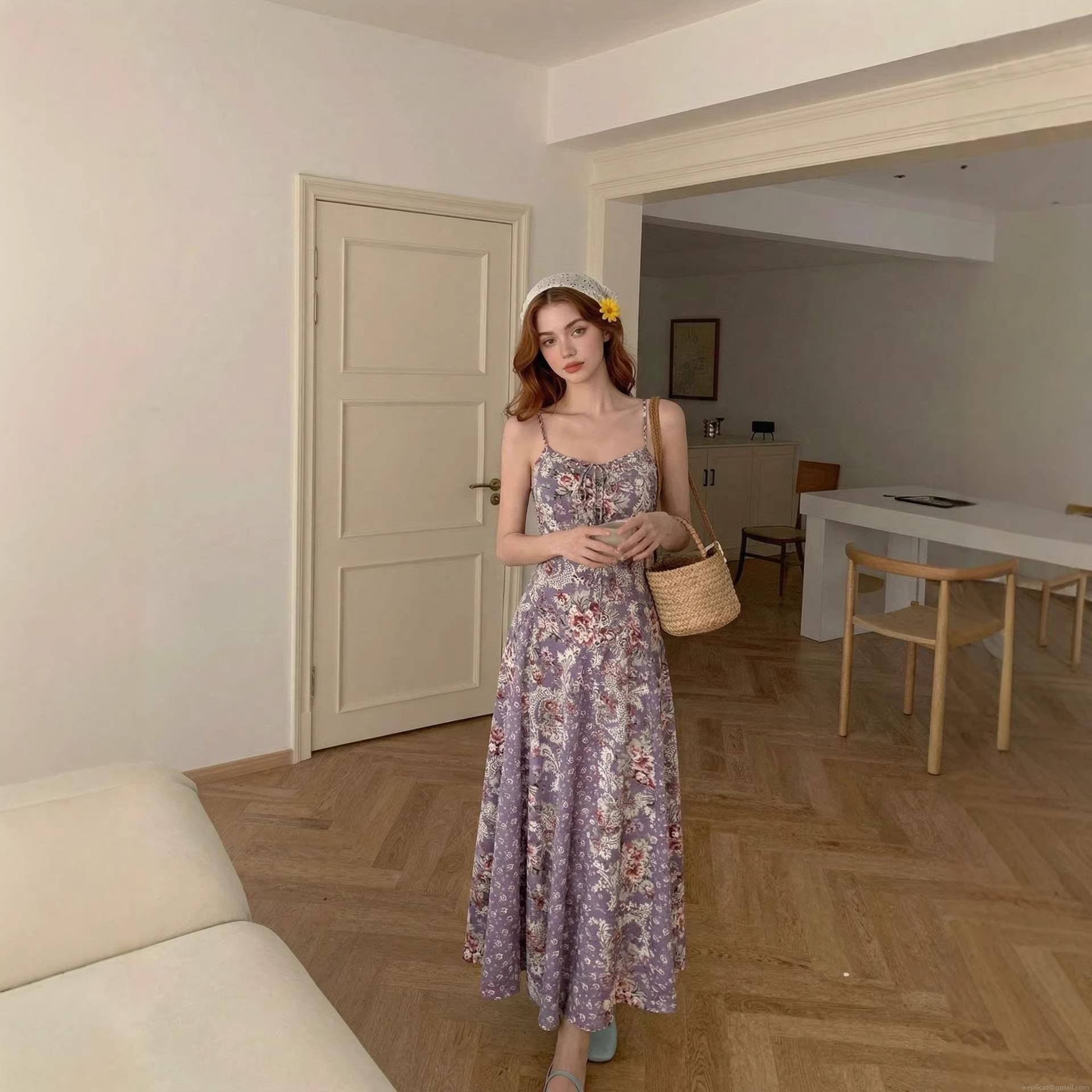 • Women's Bohemian Purple Floral Maxi Dress French Retro V-Neck Spaghetti Strap Backless Paisley Print Summer Vacation Beach Long Dress